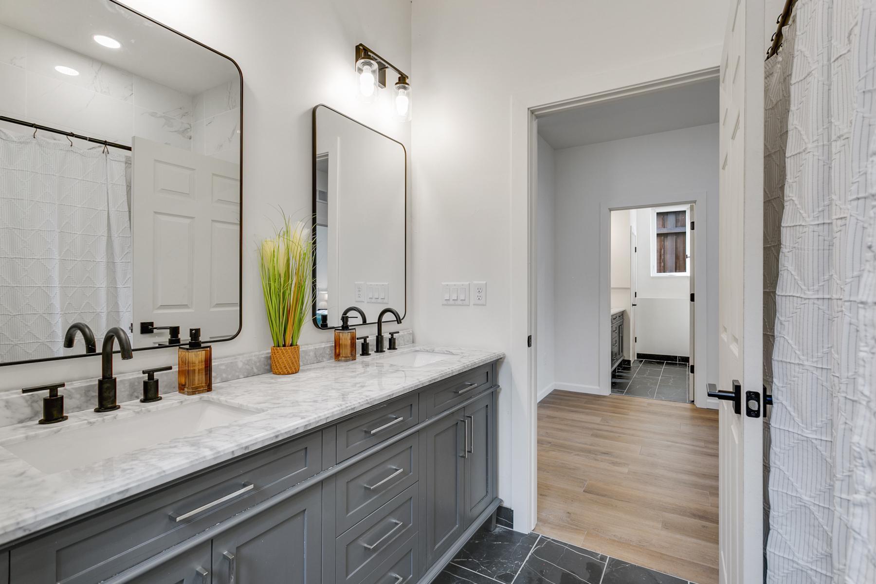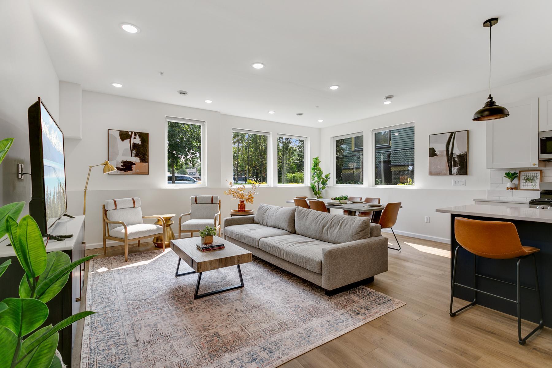 Open-concept living and dining areas are enhanced by large windows that provide abundant natural light—ideal for both everyday living and entertaining. Bedrooms offer ample closet space and include ceiling fans for added comfort. Each unit features two bathrooms with double vanities, linen storage, and standard tubs.