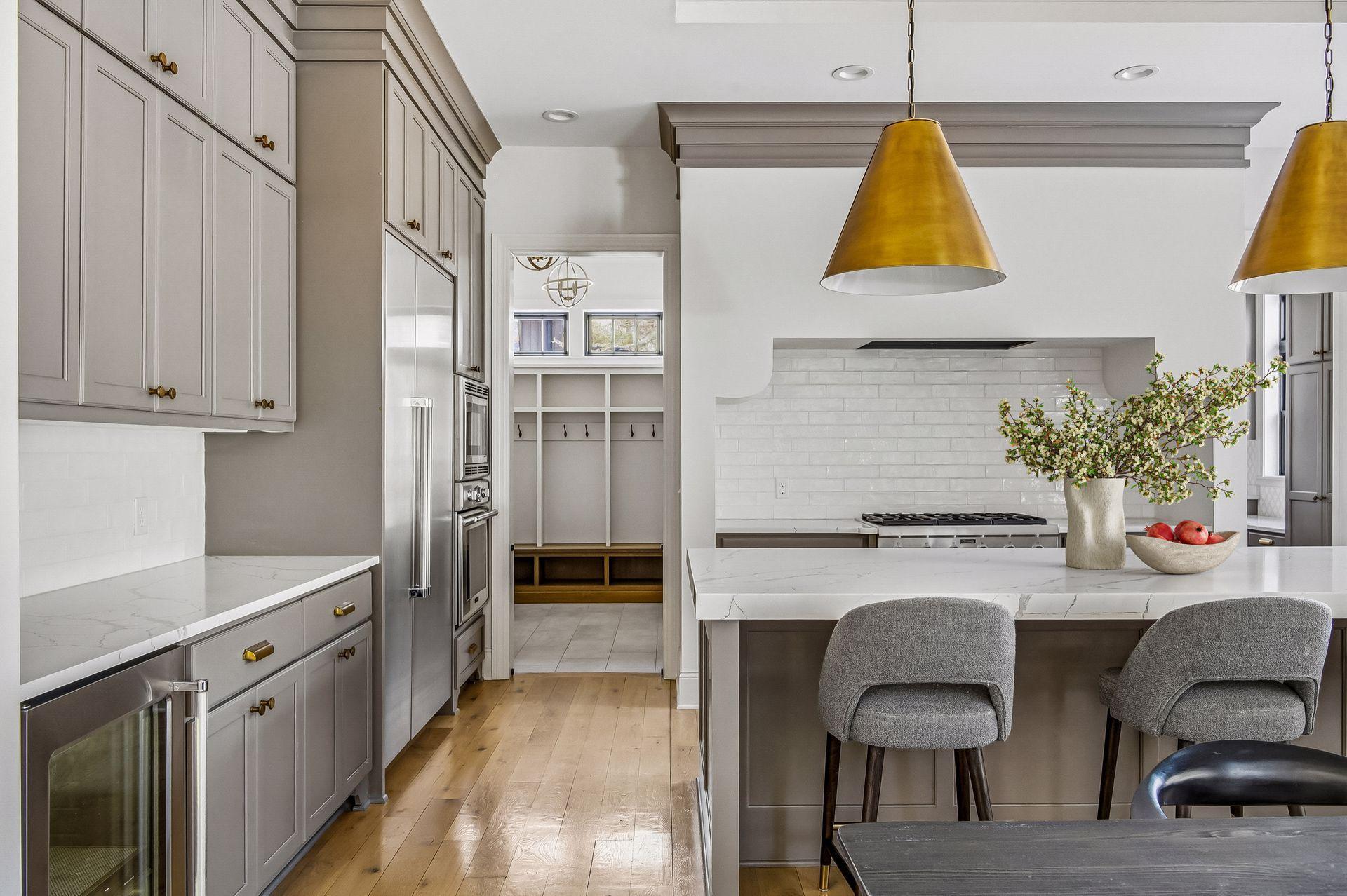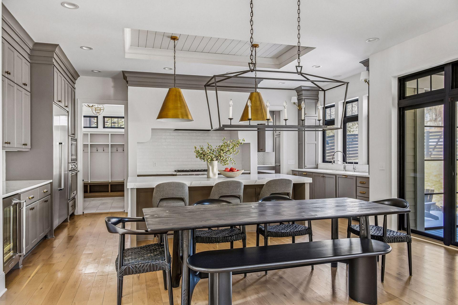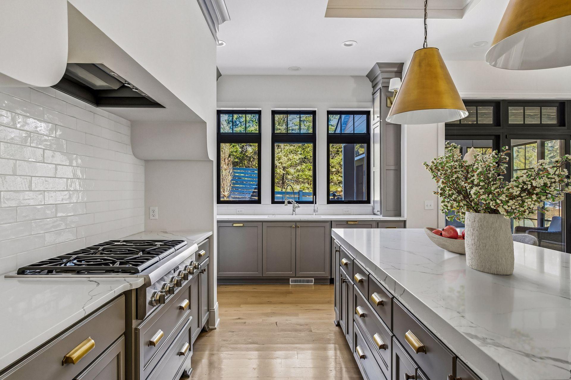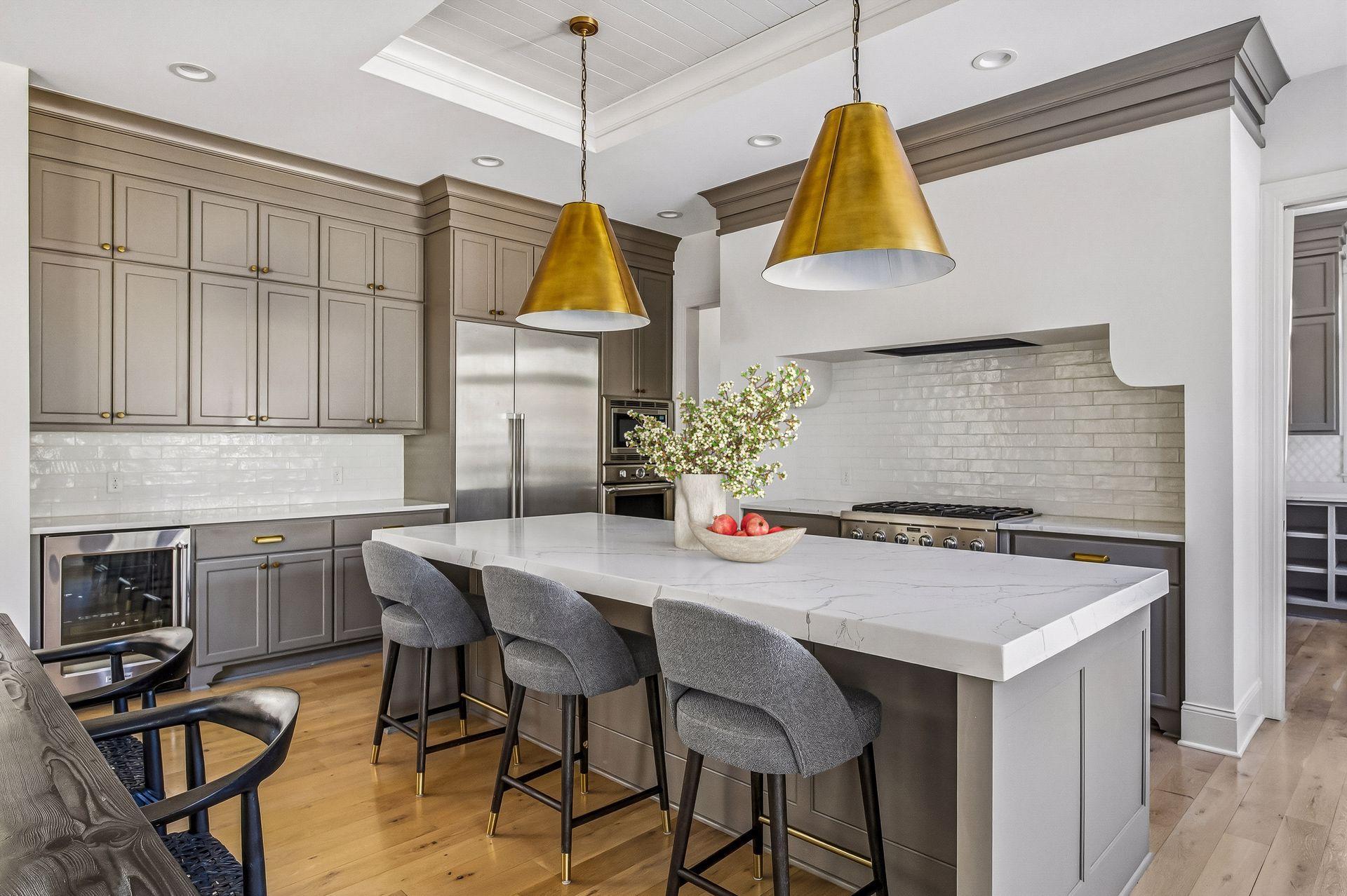 The kitchen is built for gathering with high-end appliances, full-height cabinetry, and a large center