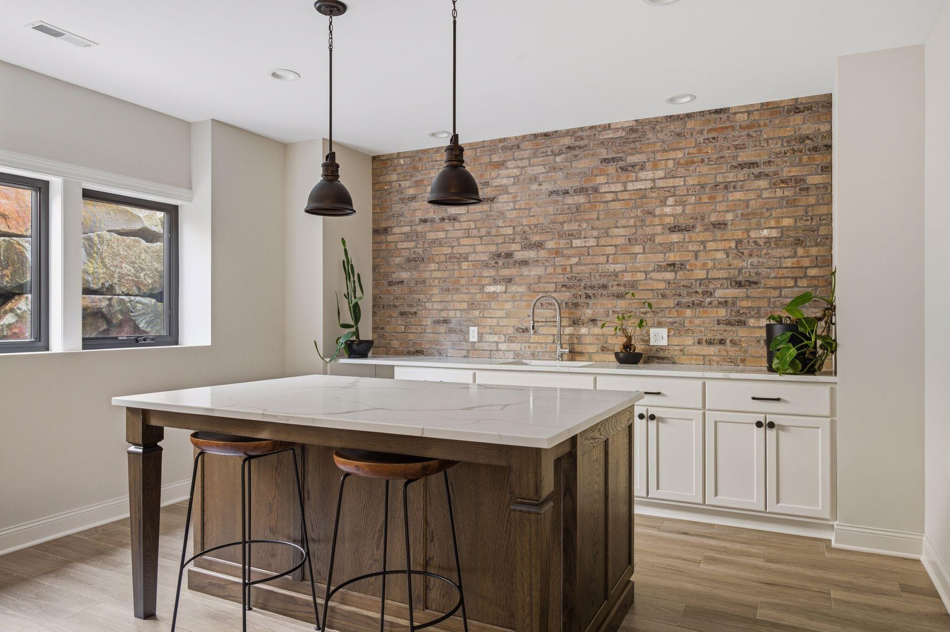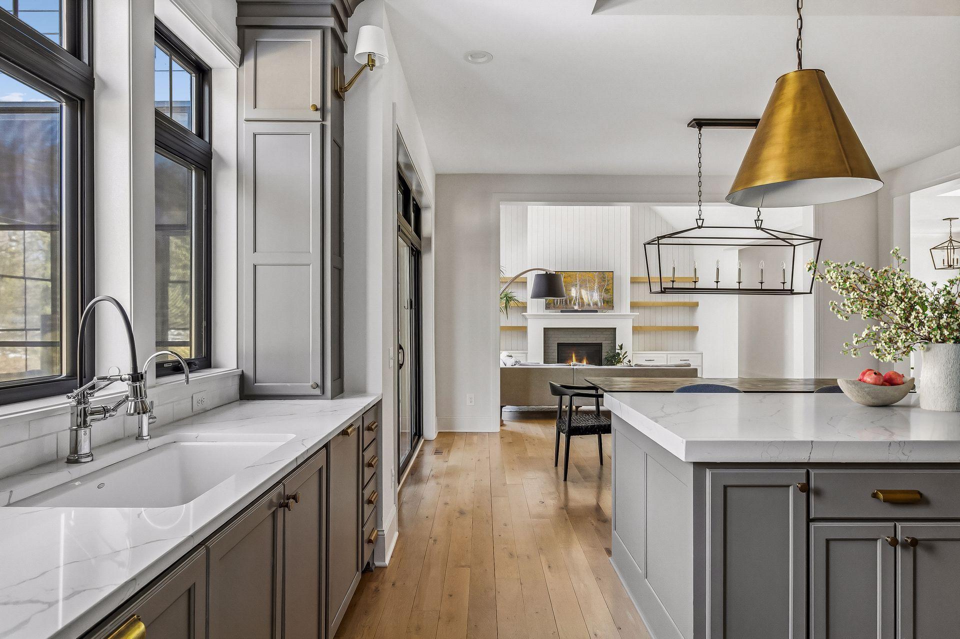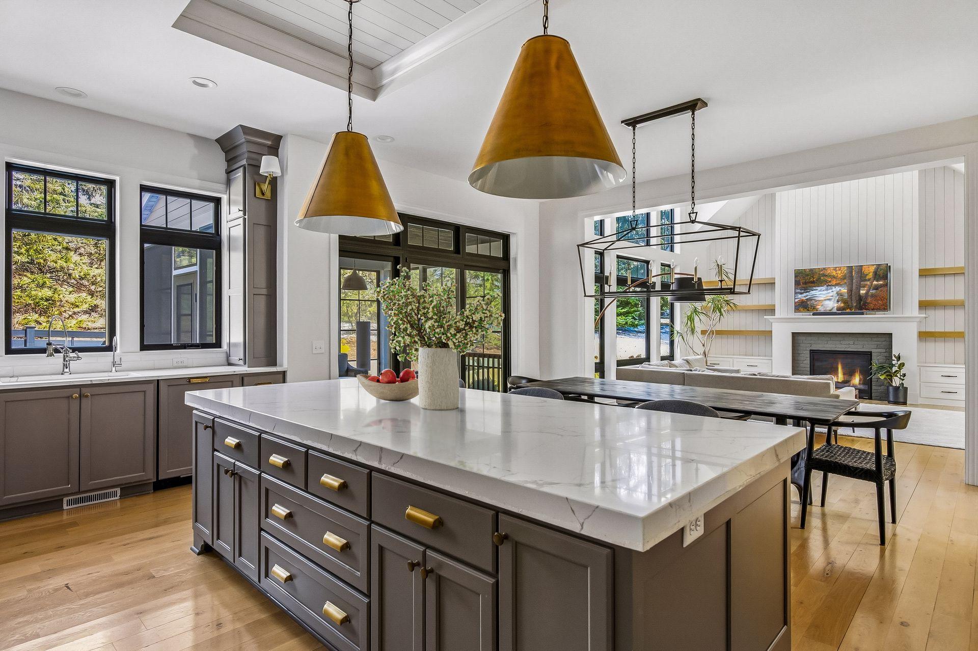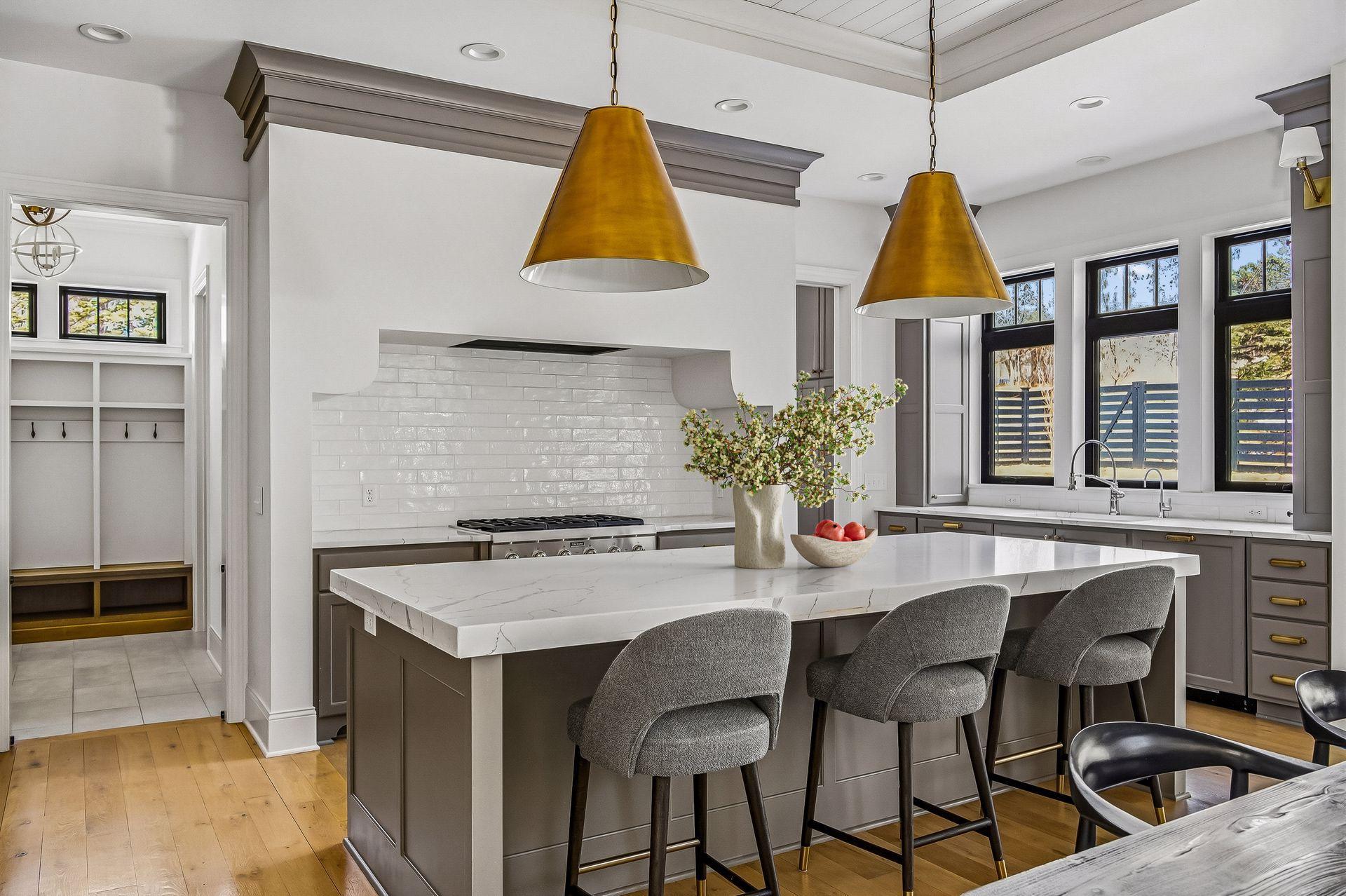 The kitchen is built for gathering with high-end appliances, full-height cabinetry, and a large center