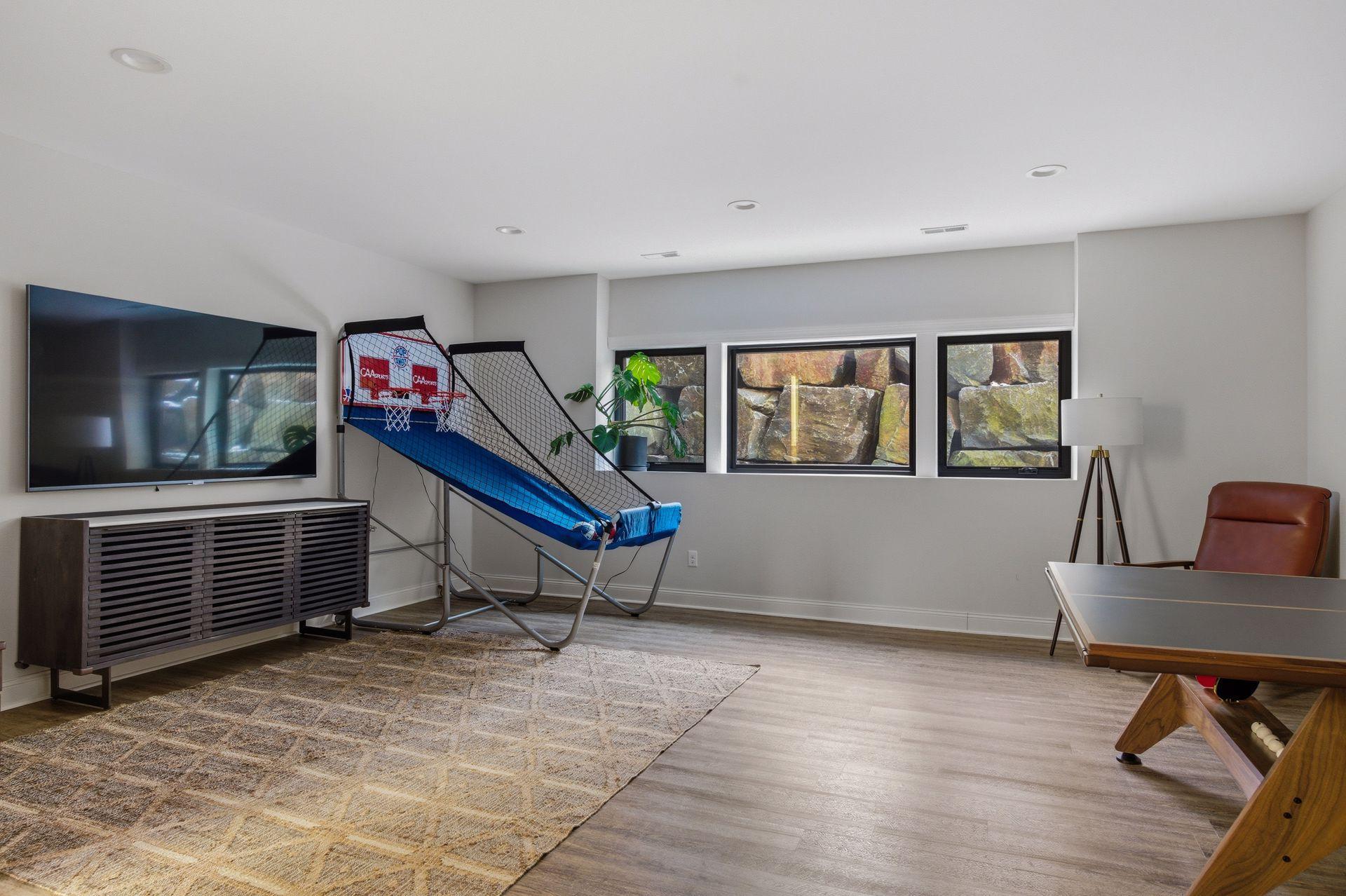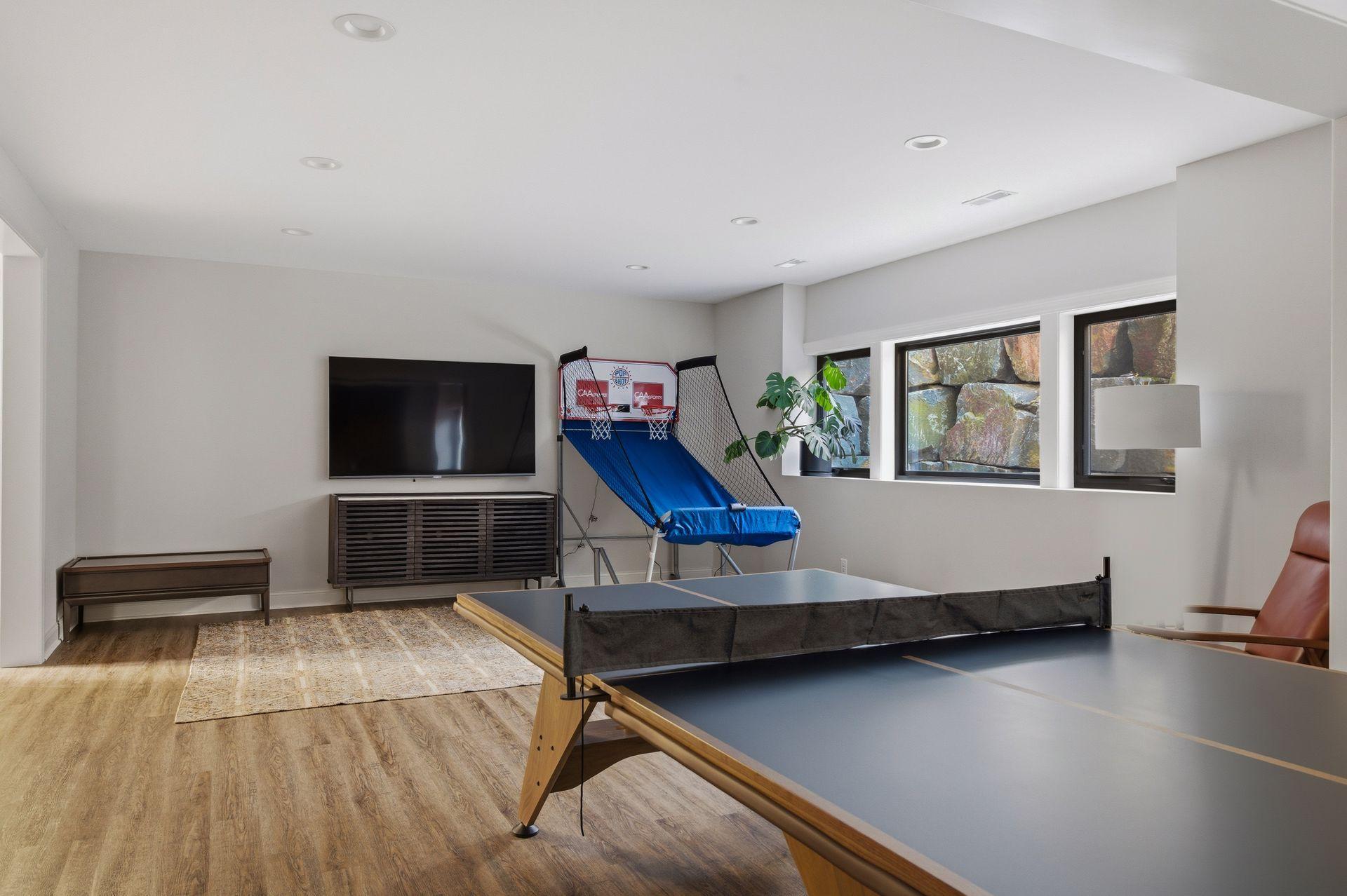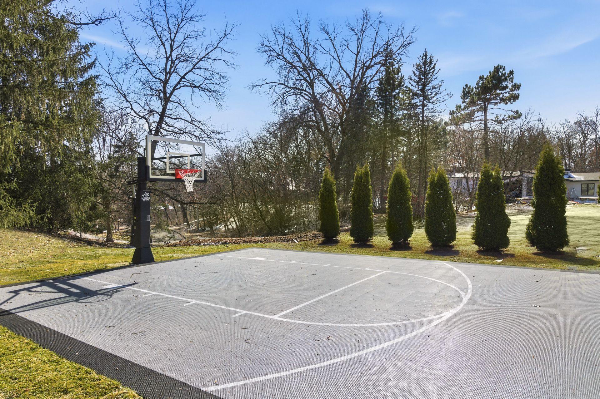 Set on over a half-acre with mature trees, the property now includes a sport court basketball