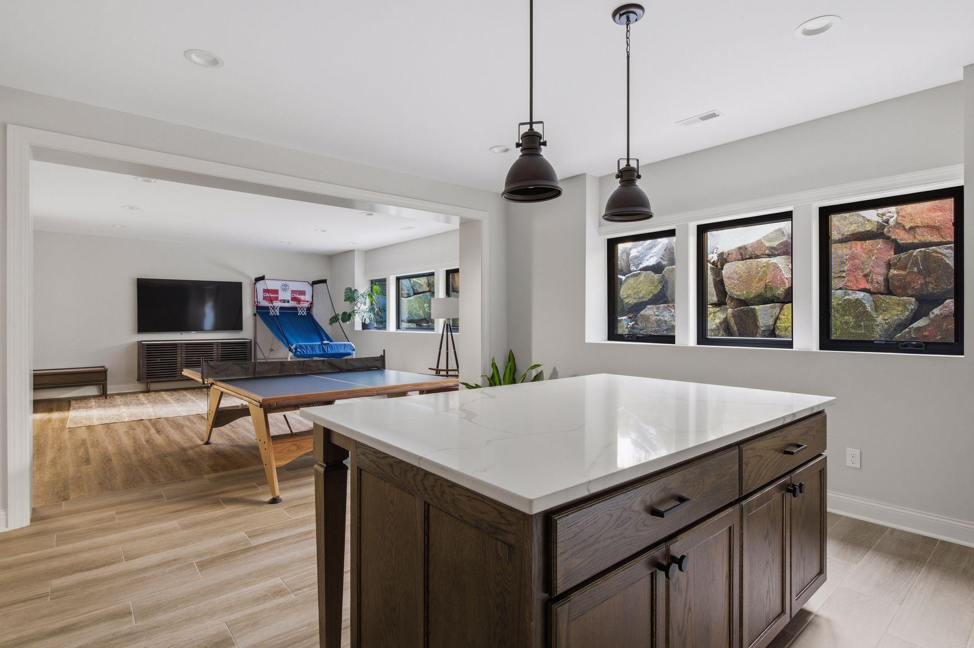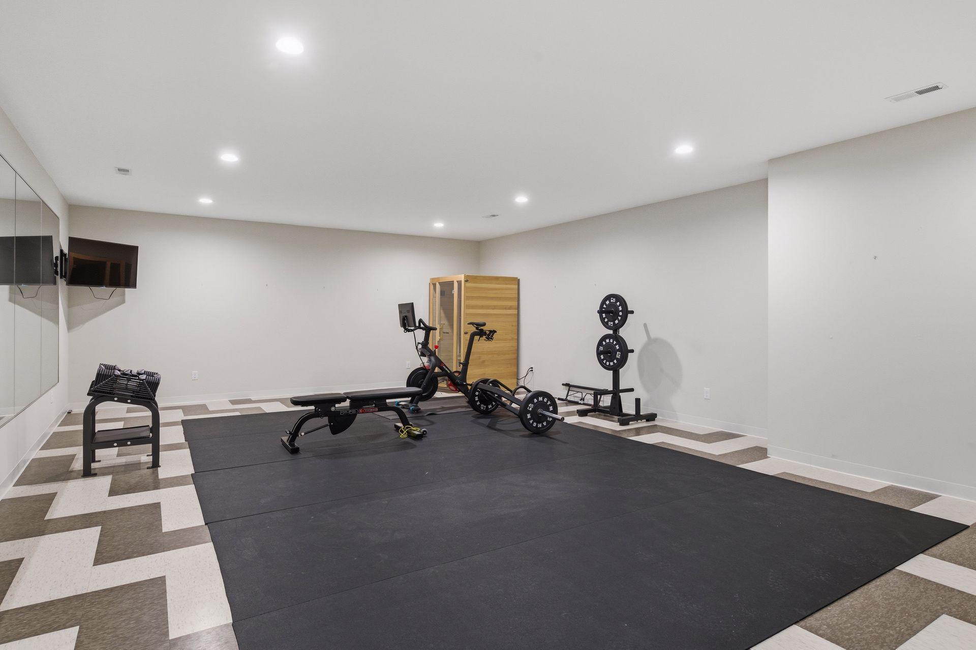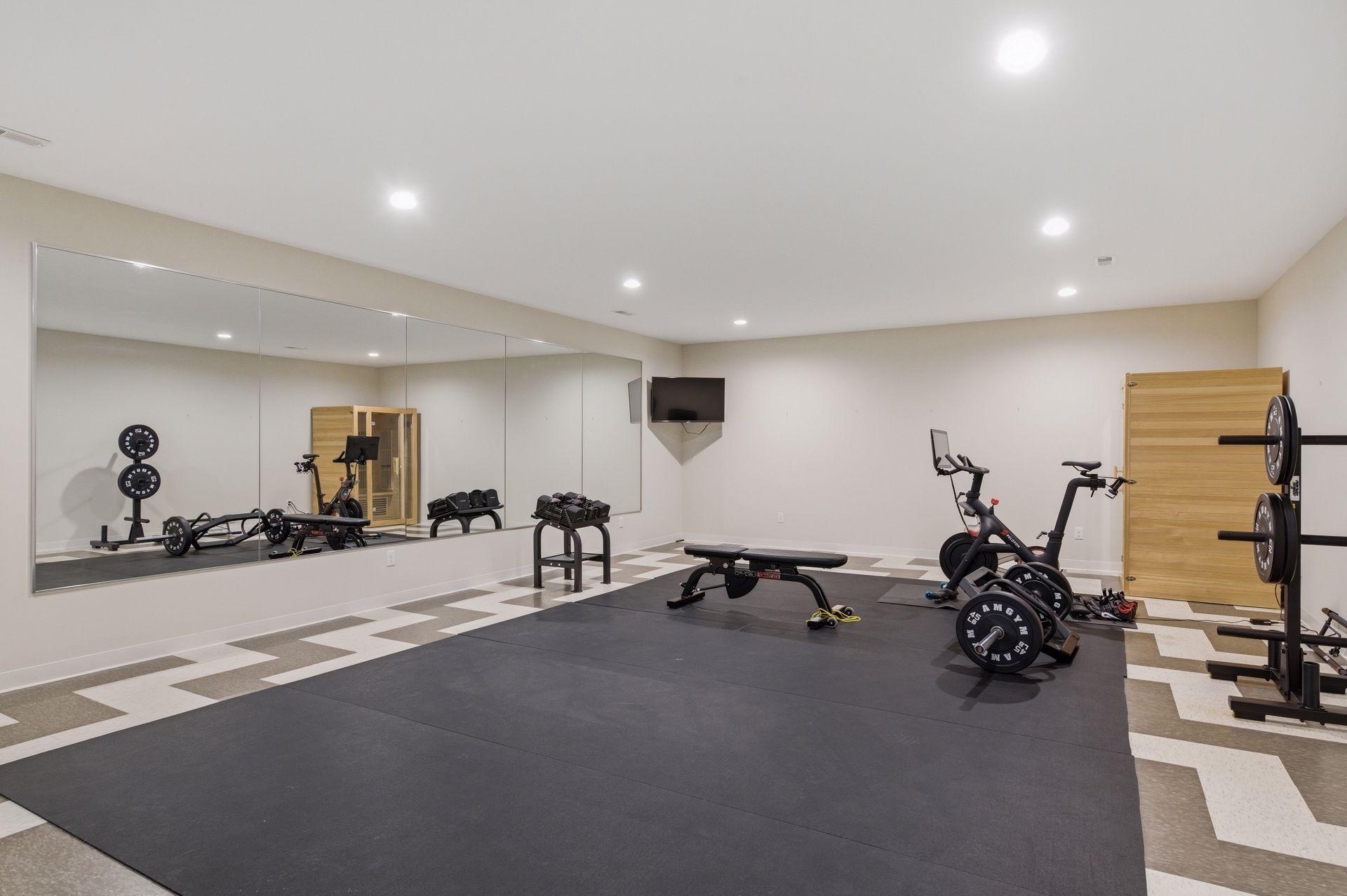room. The lower level offers a fitness area, family room with wet bar and island, plus an additional