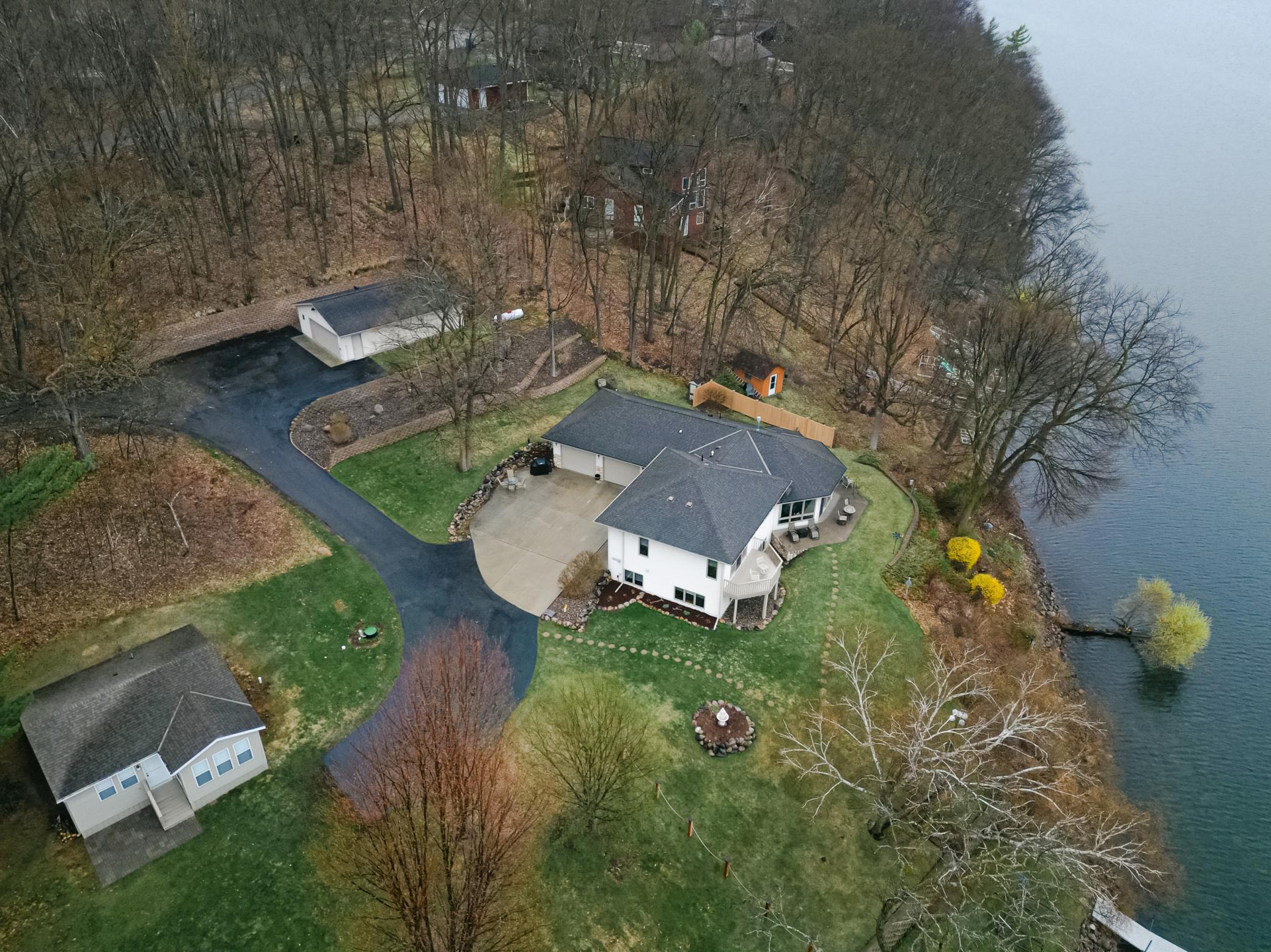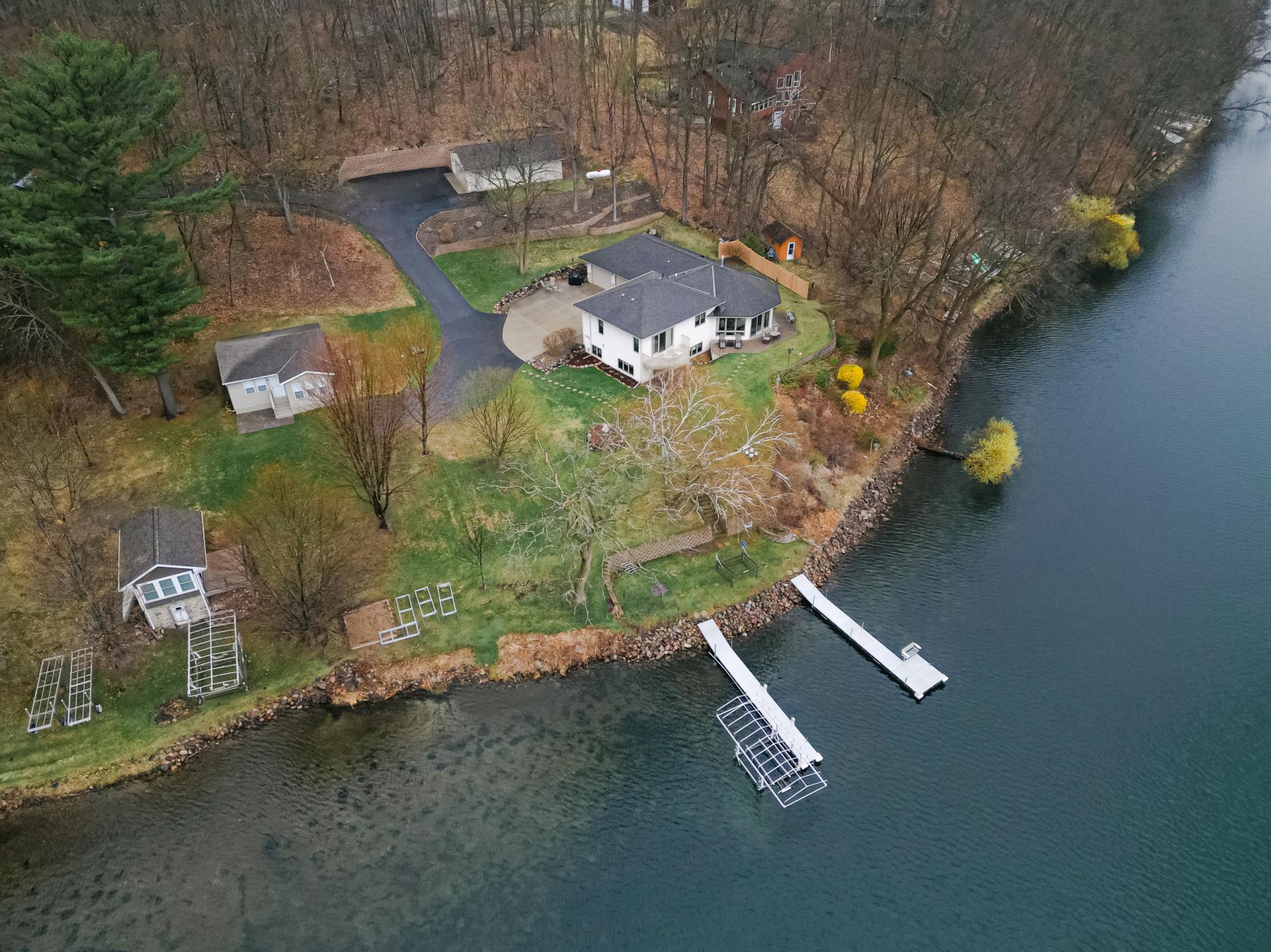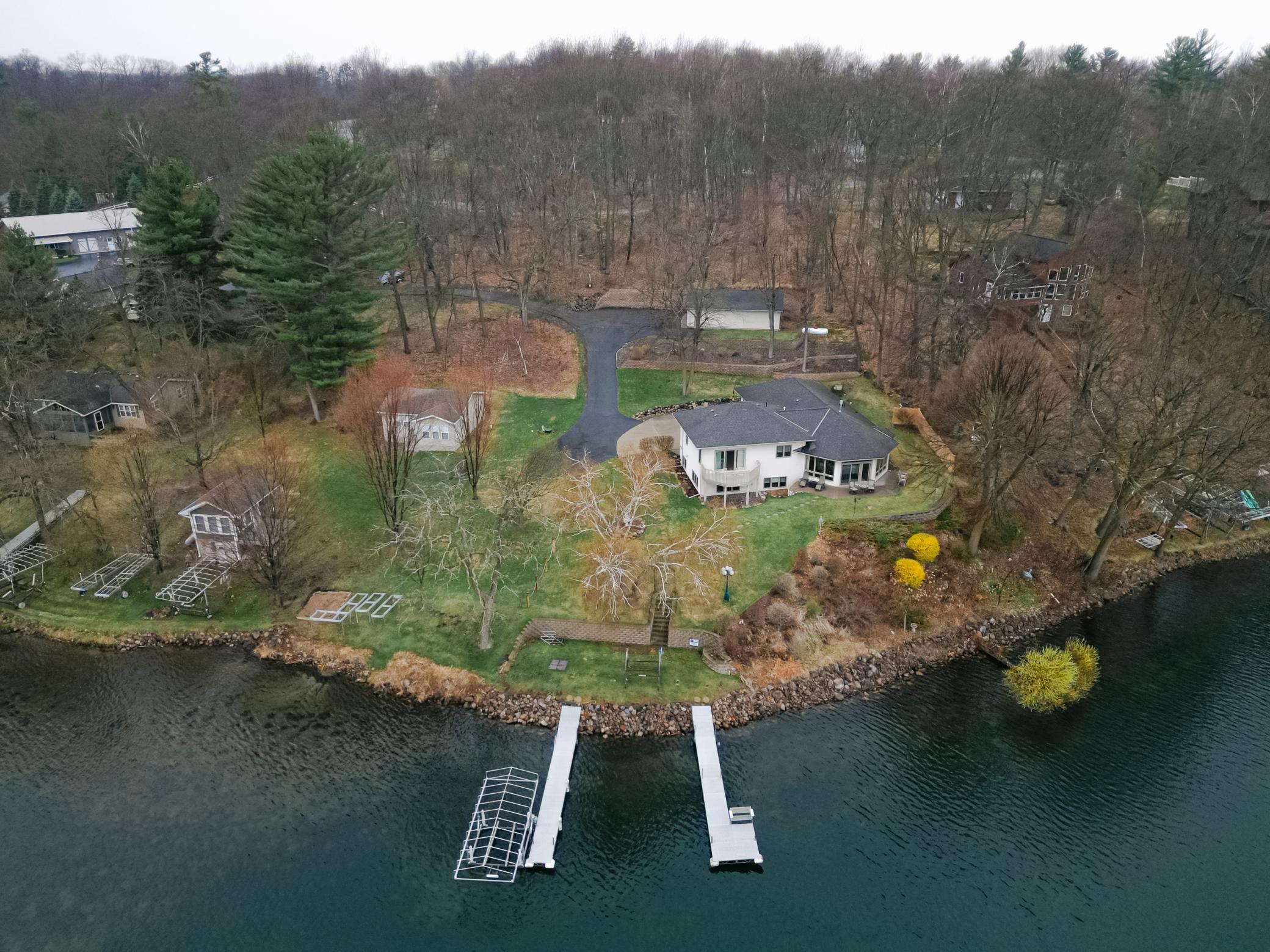 Experience elevated lakefront living on the shores of Fish Trap Lake. Set on an impressive 148 feet of pristine shoreline, this exceptional 3 bedroom/3 bath year-round retreat offers sweeping panoramic views, remarkable privacy, and the kind of natural beauty that turns everyday life into a getaway. From world-class walleye fishing right off your dock to the awe-inspiring sight of eagles soaring overhead, this is lake living at its finest. Inside, the home showcases timeless craftsmanship and thoughtful design, where no detail has been overlooked. A stunning floor-to-ceiling stone fireplace anchors the great room, complemented by granite countertops, a premium kitchen, and a whole-home hardwired surround sound system designed for effortless entertaining inside and out. Dual-fuel heating with in-floor heat, and central A/C throughout, ensures year-round comfort and efficiency. The spacious primary suite is a true sanctuary, featuring dual cedar walk-in closets with custom dressers, a maintenance free fiberglass balcony, and a luxurious spa-inspired bathroom complete with a Japanese soaking tub, glass block walk-in shower, and a double sink vanity. Outdoors, the property is equally impressive. Enjoy a fully equipped docking system, including two aluminum roll-in docks, permanent docking stations, and a 3,000 lb winch, along with a newer electric boat lift (2021). The patio provides endless opportunities to enjoy the beautiful lake views with friends and family. Attractively designed retaining walls, an in-ground sprinkler system, and hot/cold outdoor water spigots add both beauty and functionality to the landscape. Storage is abundant with an attached, heated and insulated two-stall garage, as well as a detached 24’x36’ garage capable of accommodating up to four vehicles - perfect for your lake toys and hobbies. Significant updates include new Marvin windows throughout (2018), a full kitchen appliance suite (2020), and a new water softener (2023), ensuring peace of mind for years to come. This is more than a home - it’s a lifestyle. Schedule your private showing and discover the rare opportunity to own a truly serene lakefront property.