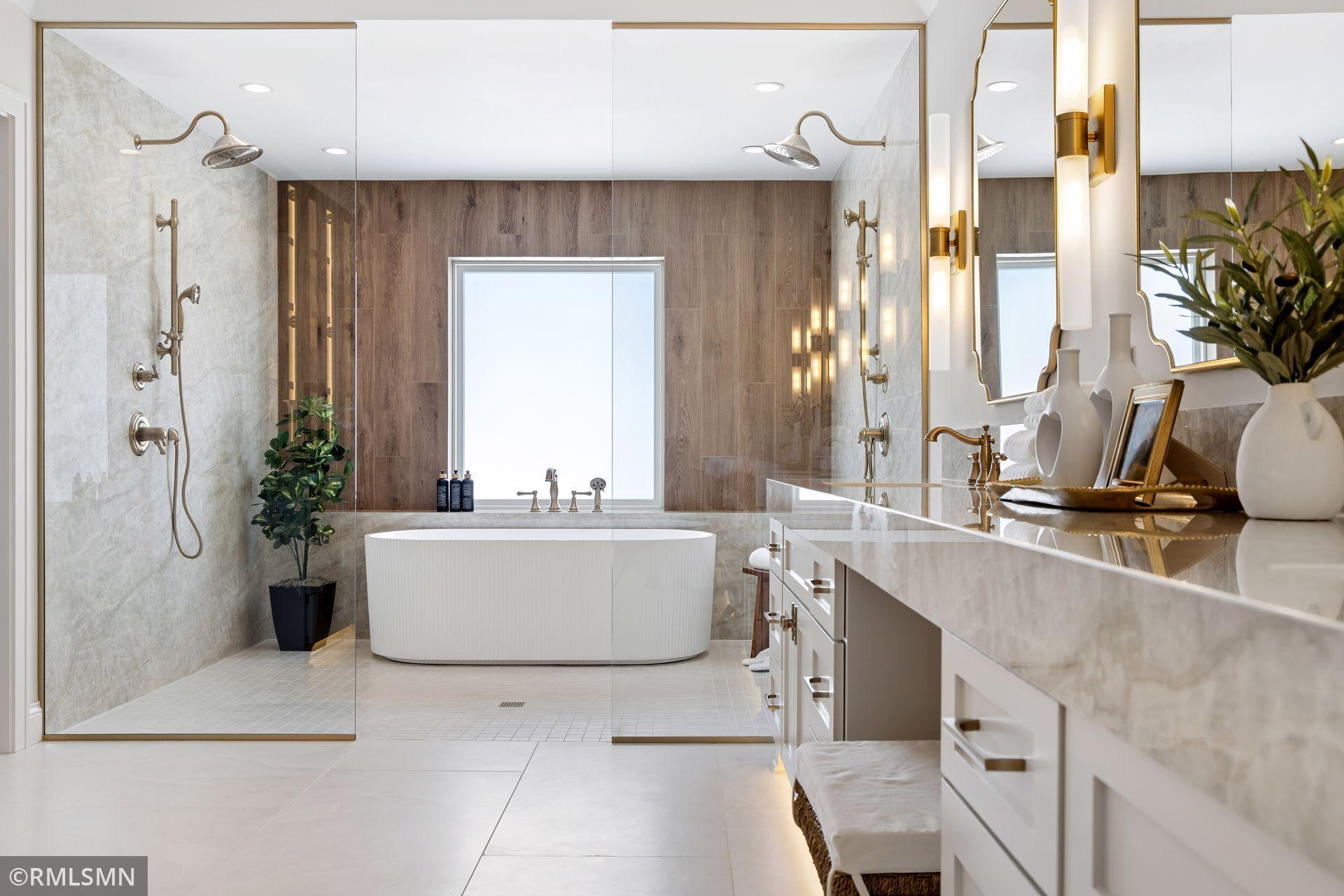 James Hardie exterior, Andersen windows, Upgraded millwork package, ten foot ceilings main level, floor to ceiling windows, SKS appliances, dual washer/dryer, Hardwood flooring, Bathroom for every bedroom, Five car garage, 7.8 acre wooded site, turnaround driveway, all quartz counters, Primary with sitting room, huge Primary bath with water room, outstanding Primary closet, Media with 100” TV, wet bar, game area, exercise, Gym.