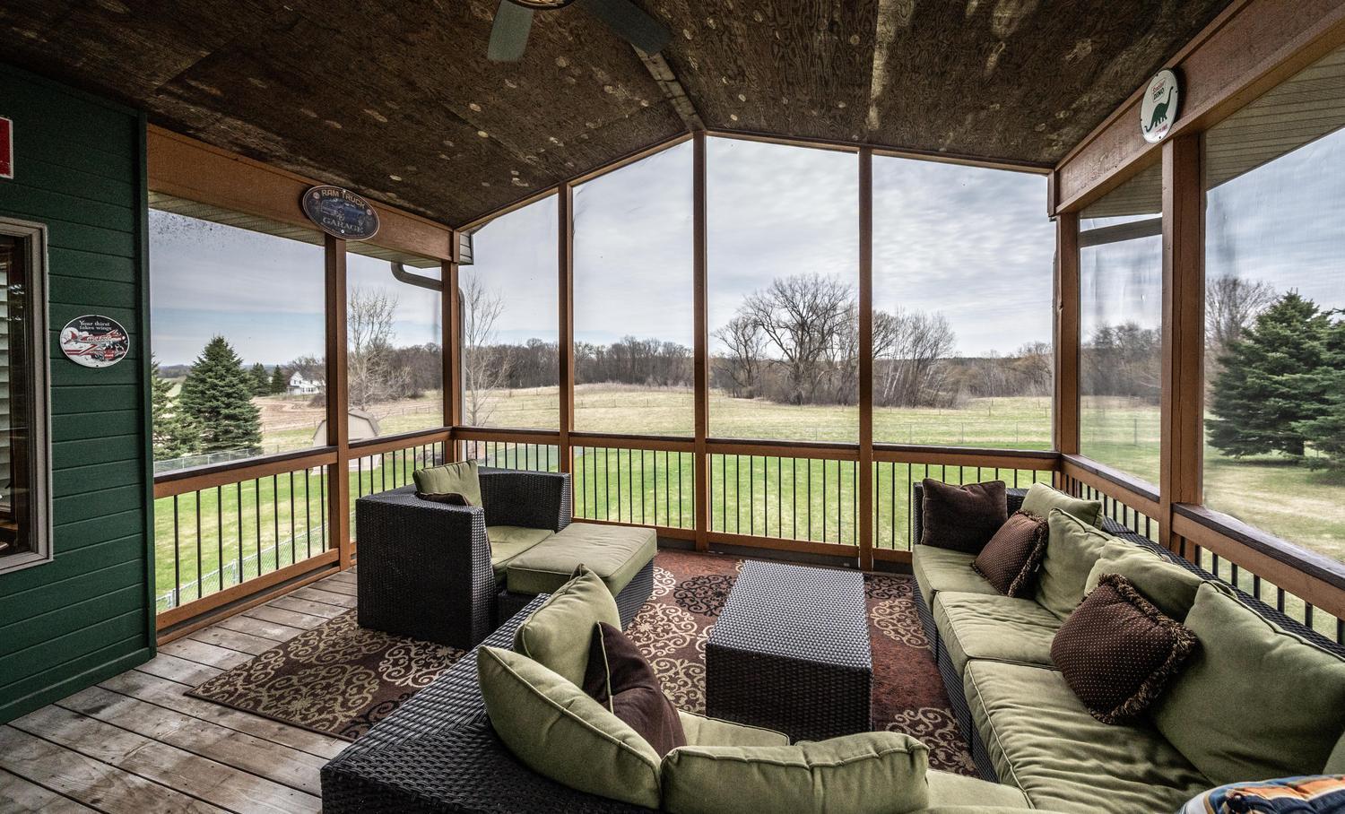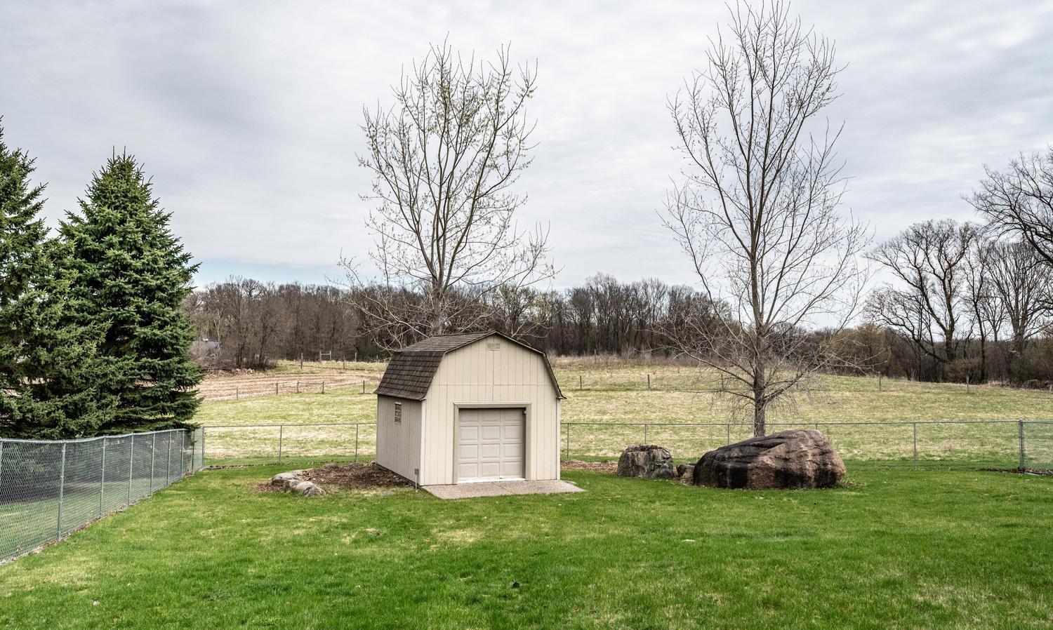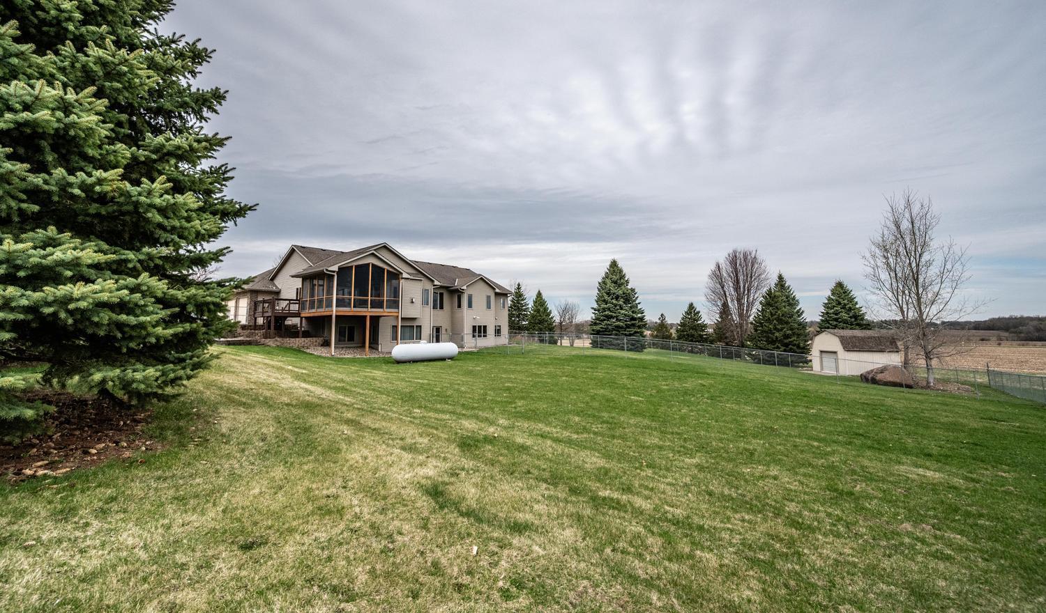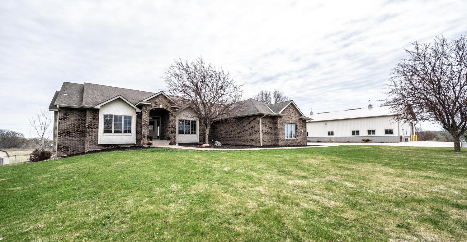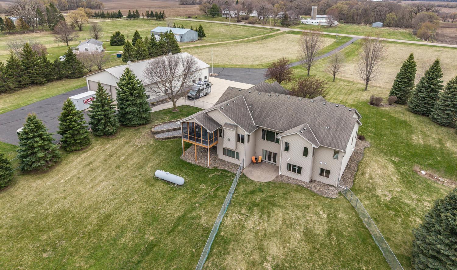 This beautiful 2003-built McDonald custom home, situated on 12 gently rolling acres with incredible views in every direction, offers exceptional features both inside and out. The main level includes a spacious formal dining room and a living room that lead into a den and an updated gourmet kitchen. The kitchen is equipped with granite countertops, stainless steel appliances, and a walk-in pantry, providing convenient access to a fully screened deck. In the north wing, you will find a primary suite featuring a large walk-in shower, a soaking tub, and multiple closets. This wing also houses a third bedroom currently used as an office, as well as a spare bedroom with a private, updated three-quarter bathroom. The lower level offers a family room with a bar and a large entertainment space, complete with a full-size pool table, a fourth bedroom, an additional three-quarter bathroom, and ample storage. The well-maintained mechanical systems are easily accessible and include a forced-air furnace, an in-floor boiler system, and geothermal equipment. Attached you'll find the three-car heated garage and a highly functional 50 x 80 pole shed. The shed contains a finished 23 x 24 office with a half bath, a front shop/wash bay, and heated rear area with a full mezzanine. Additionally, a full home and shop generator is included to ensure uninterrupted power.