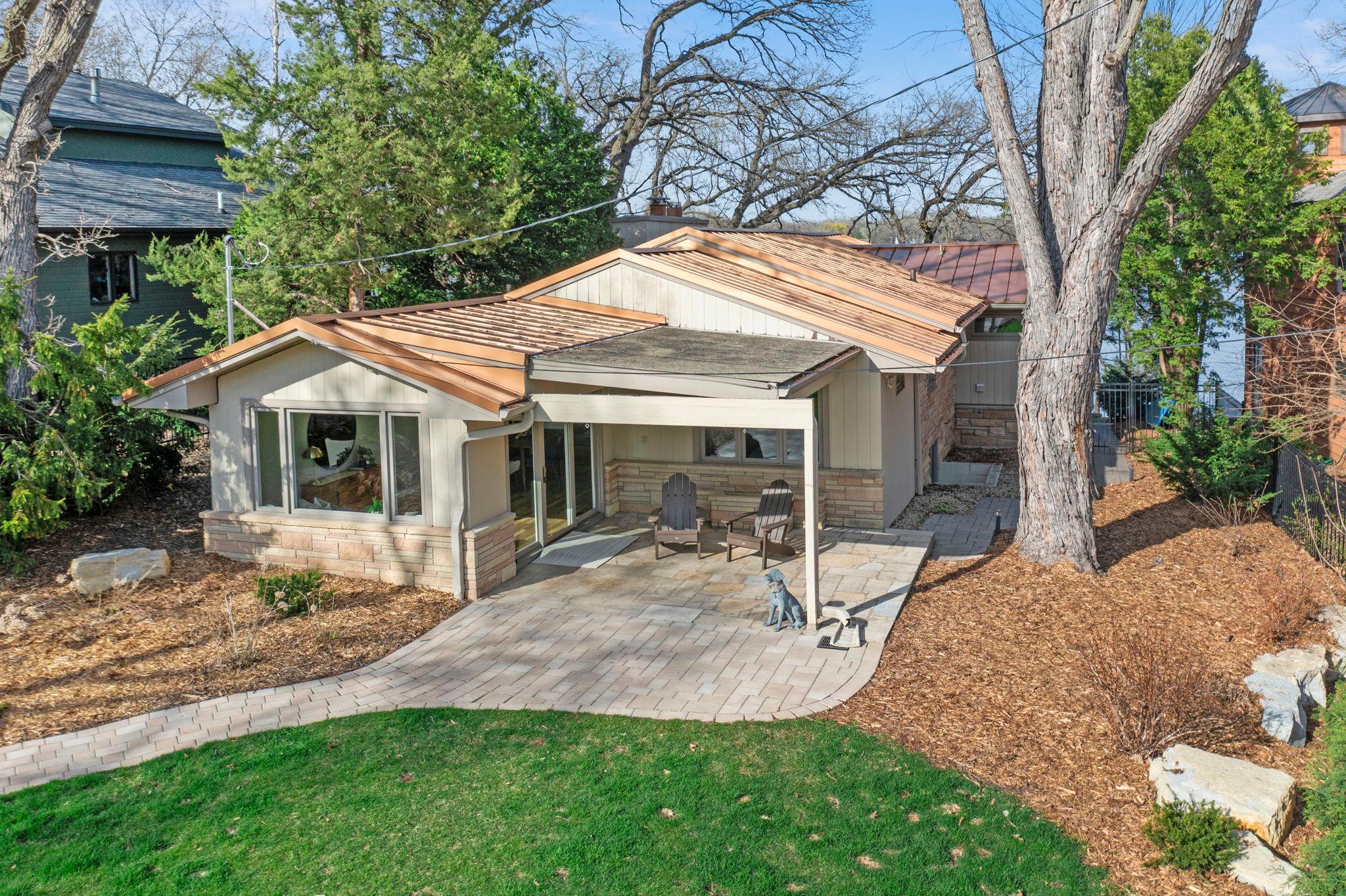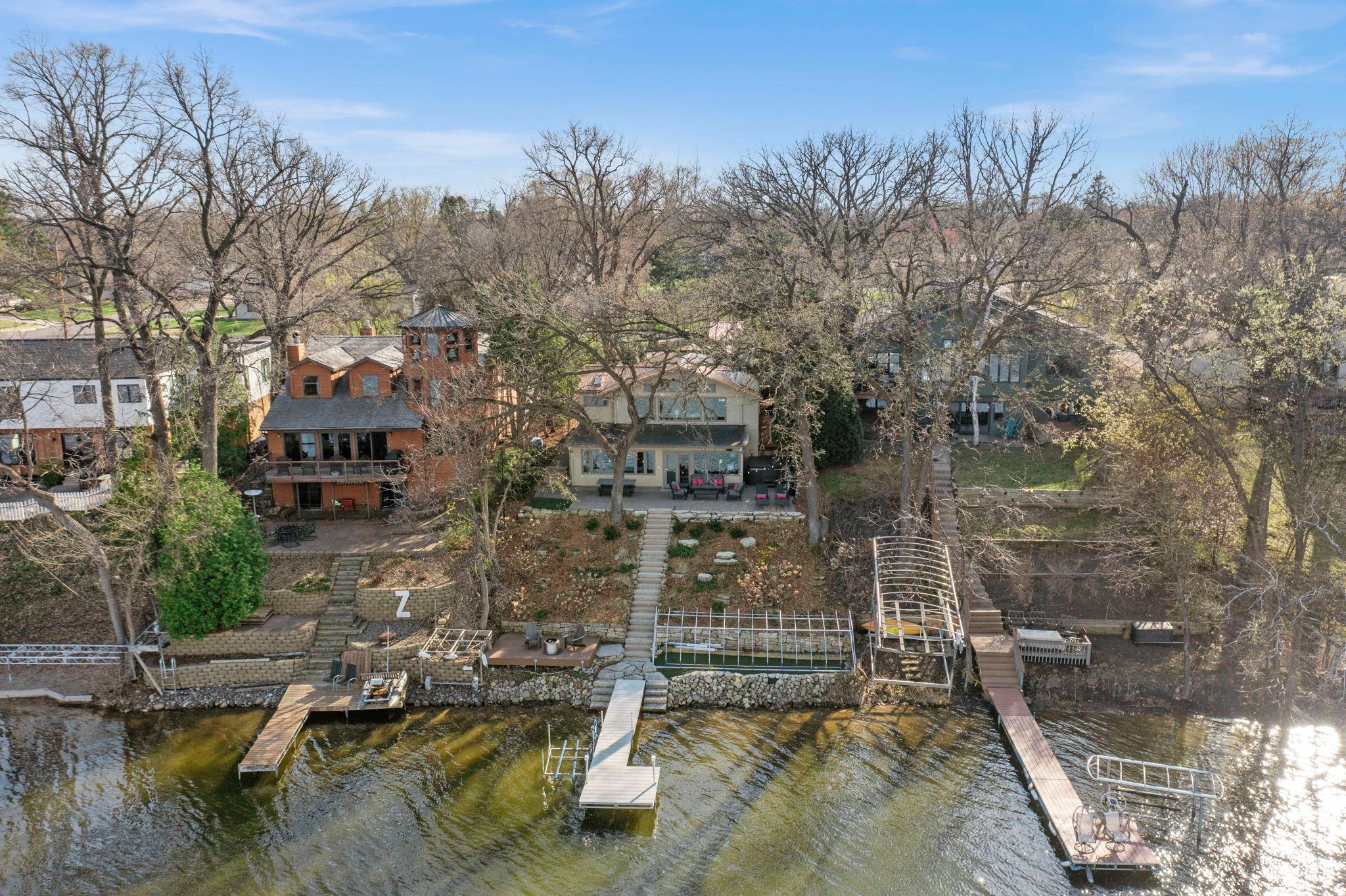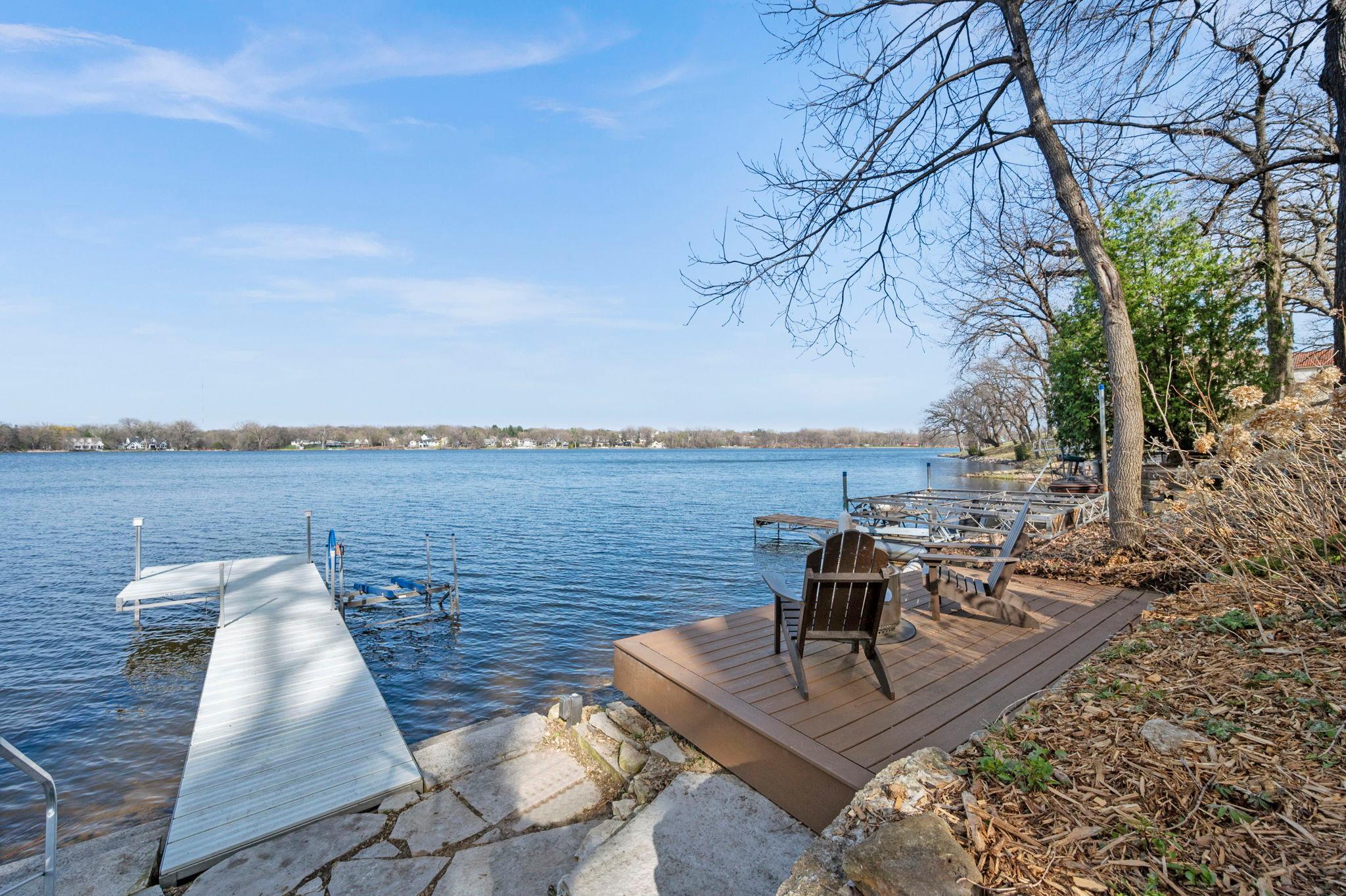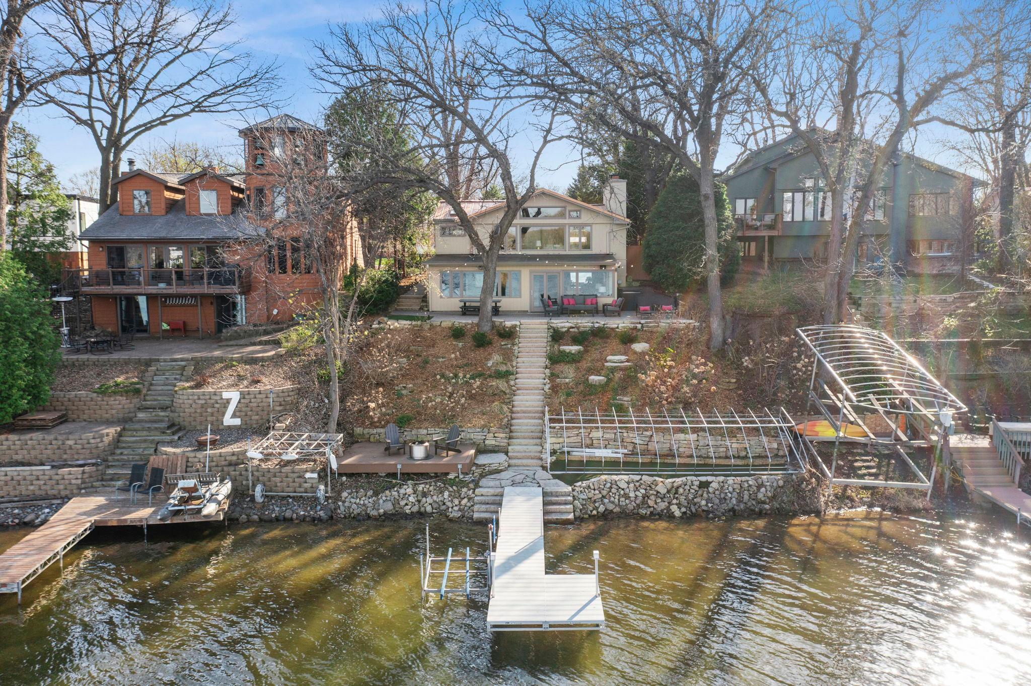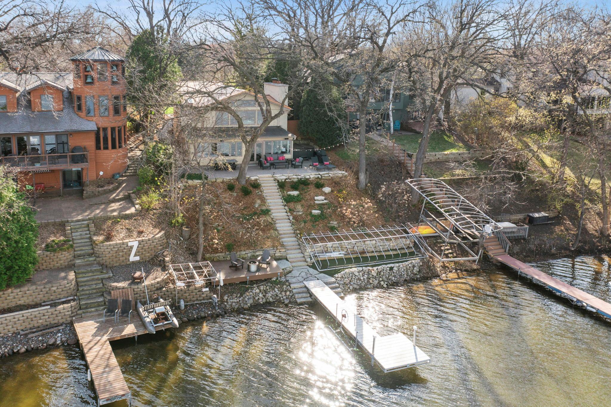 Stunning mid-century rambler on Lake Josephine—an exceptionally rare opportunity in the sought-after 621 school district. This 4-bedroom + office, 3-bath, 2+ car home is perfectly designed for effortless living, low maintenance, and unforgettable entertaining—an uncommon combination for lakefront property. Perched among the trees, the home offers breathtaking lake views from nearly every room, while still being just 12 minutes from both downtowns. Lovingly restored over time by a long-term owner, every detail reflects thoughtful upgrades and high-quality craftsmanship intended for forever living. Custom woodwork shines throughout, featuring hickory and original peg hardwood floors on the main level, along with a striking walnut mantle in the great room and office. The upper-level walnut bar includes separate wine and beverage fridges, while the lower level boasts a maple bar and custom walnut built-ins in the primary suite. The kitchen’s original pink metal cabinetry delivers iconic mid-century “Mad Men” charm, complemented by a versatile main floor layout and a dramatic full wall of Kasota stone. Two bedrooms and a beautifully designed ¾ bath complete the main level. The walkout lower level lives like anything but a basement, featuring a spacious family room, custom wet bar, and serene primary suite with panoramic lake views. The suite includes dual closets and a spa-like bath with custom tilework, steam shower, soaking tub, and dual vanities. A fourth bedroom, additional ¾ bath, laundry room with custom dog shower, and workout/storage space complete the level. Major updates include a metal roof, updated windows, fully redone plumbing and electrical, Kinetico water filtration system, and radon mitigation. The heated, insulated, and finished garage features custom epoxy floors. Outdoors, over $250K has been invested in professionally designed landscaping, including custom stonework, new driveway, metal fencing with four gates, paver walkways, patio, lakeside deck, putting green, and extensive low-voltage lighting. An attached storage hut provides ample space for all your lake gear. This is a one-of-a-kind property that truly has it all.