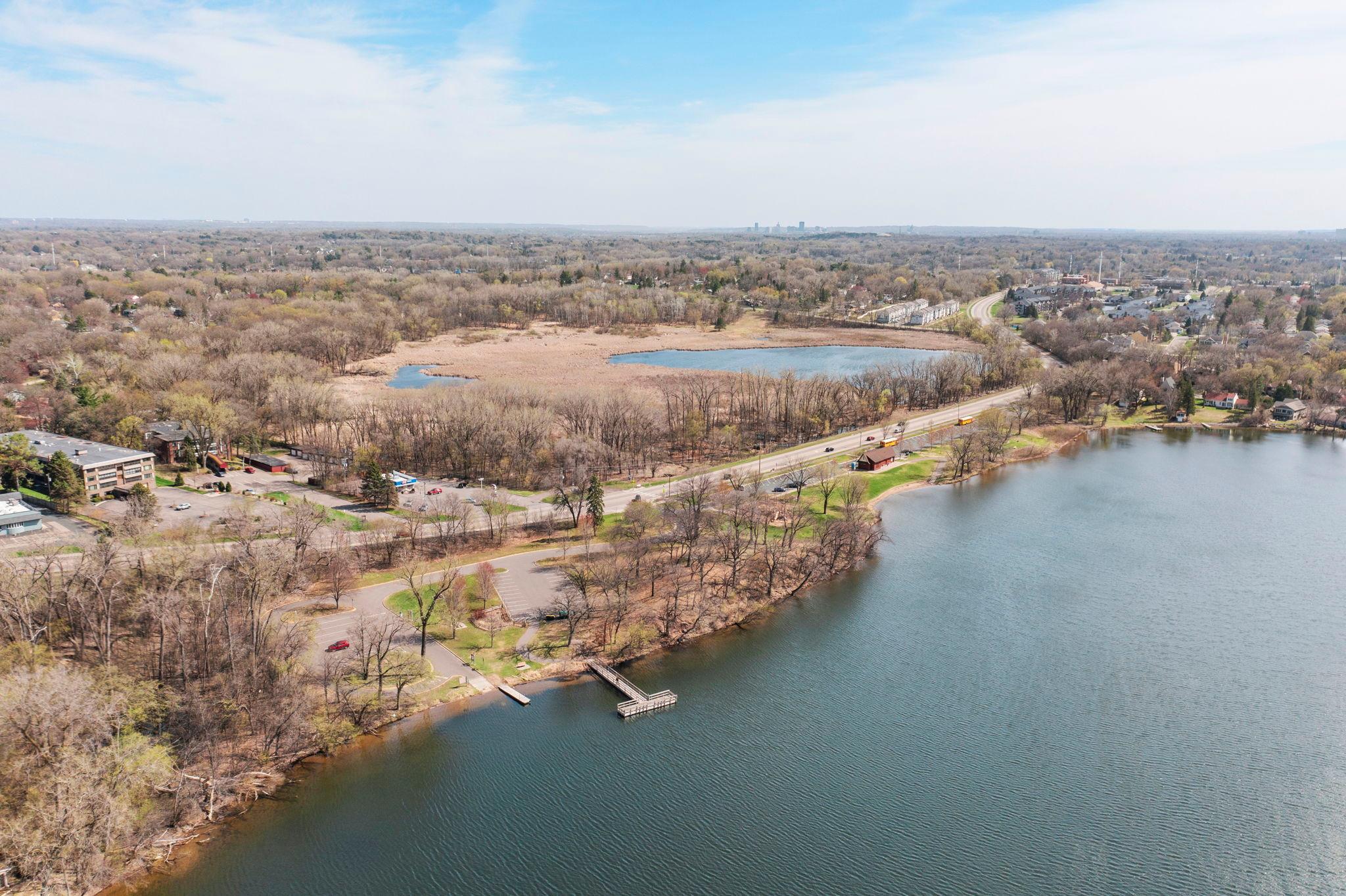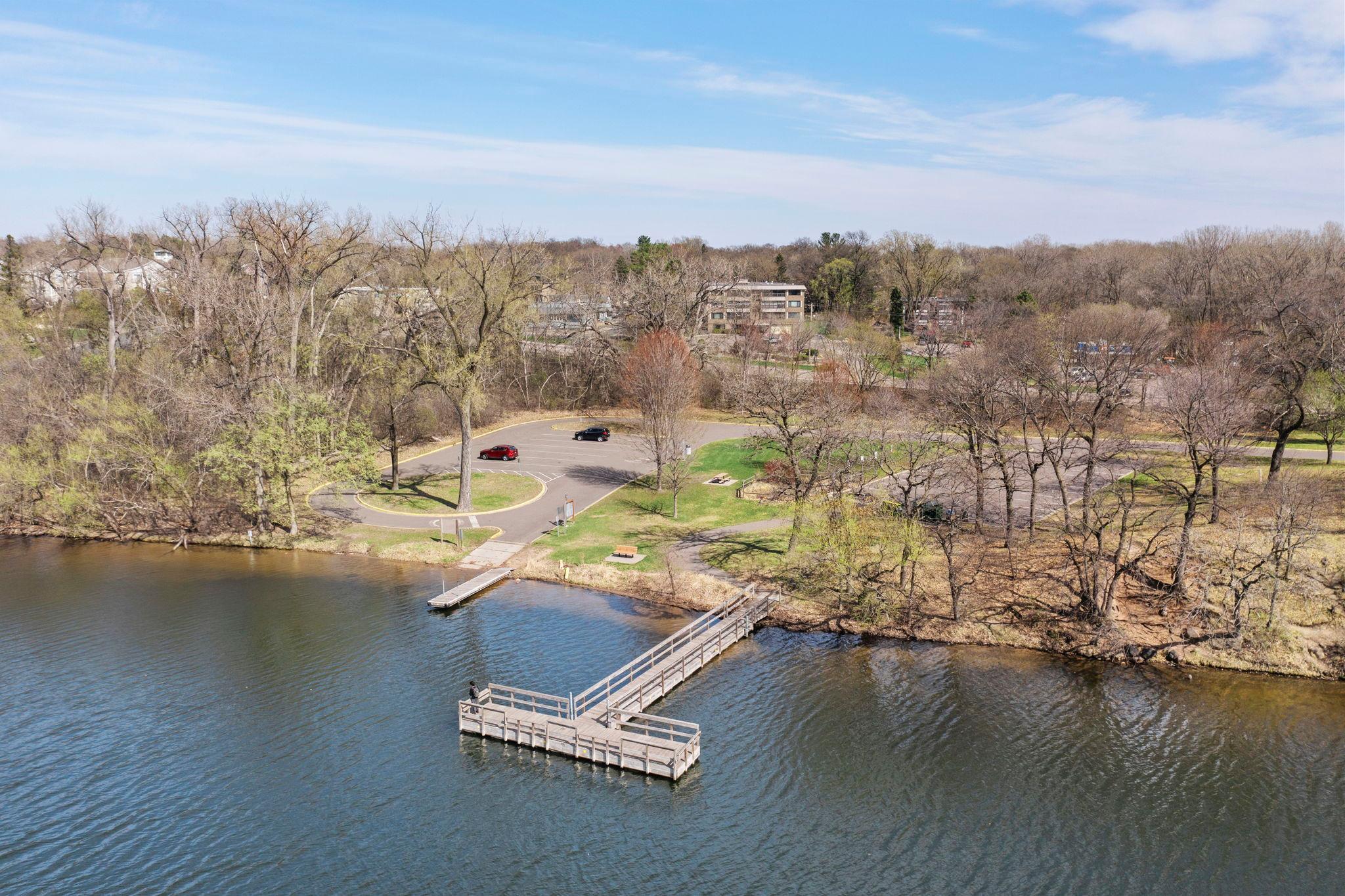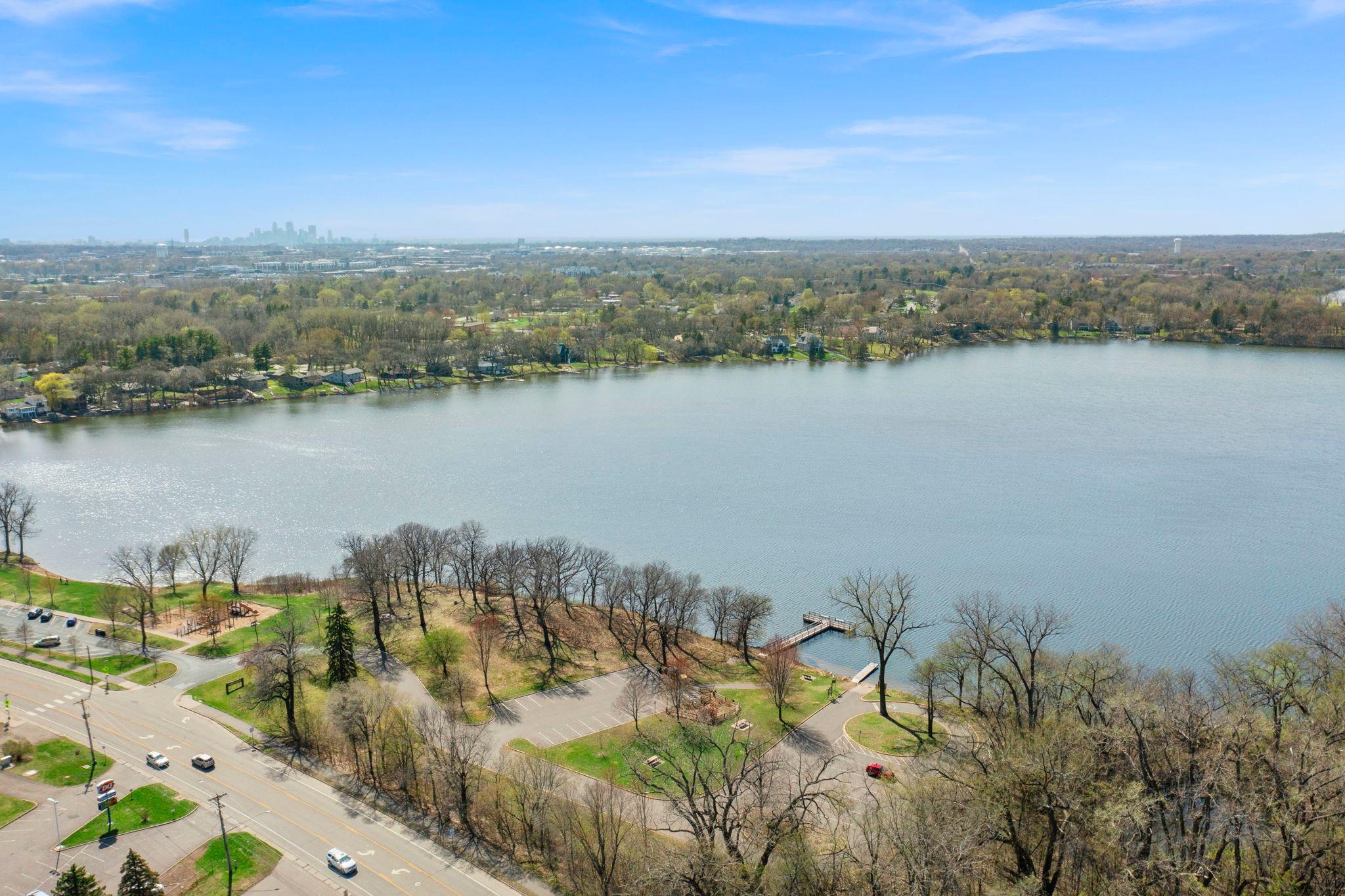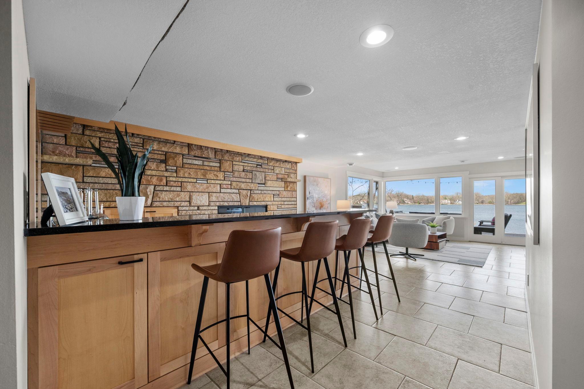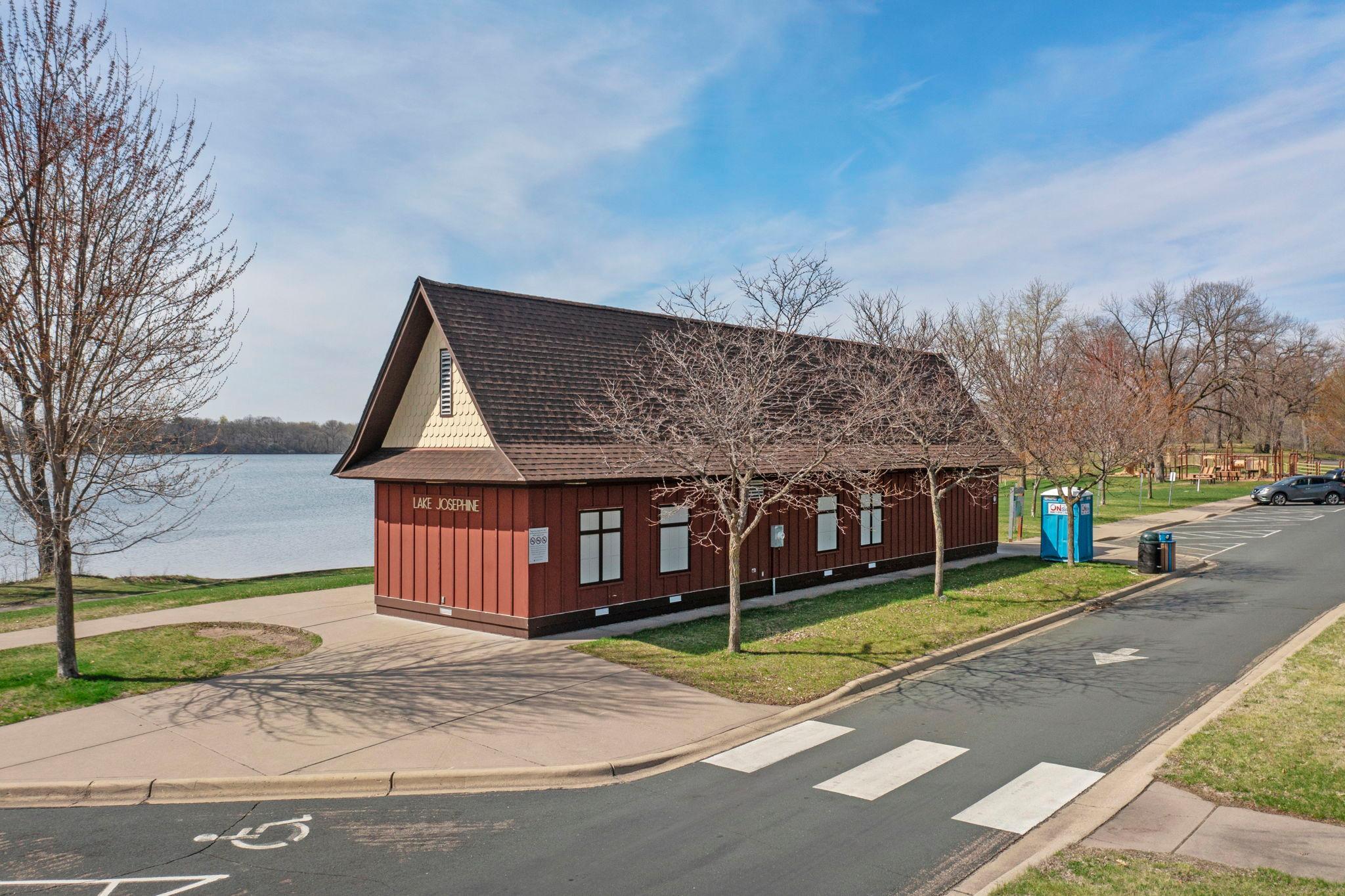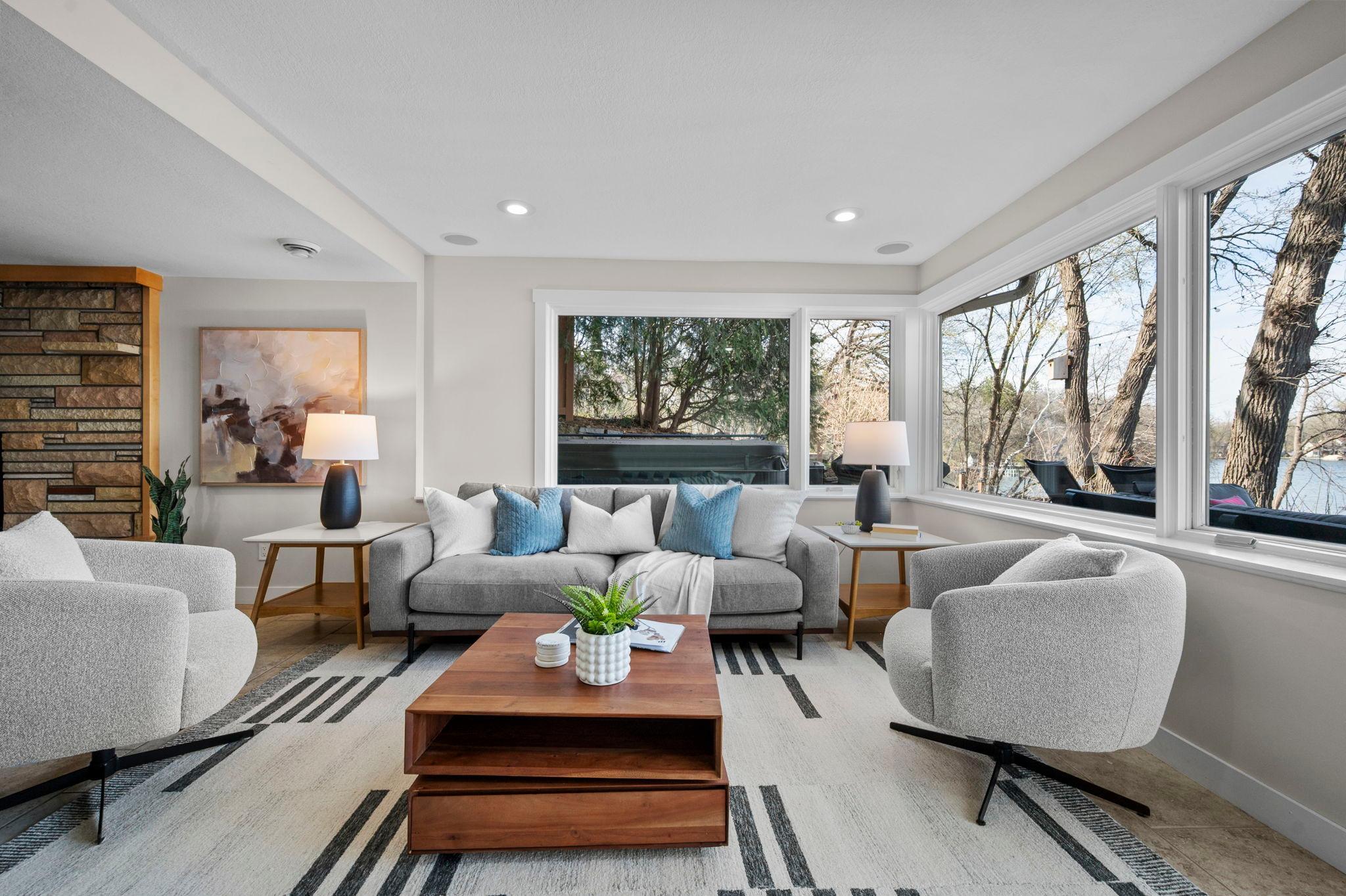 Stunning mid-century rambler on Lake Josephine—an exceptionally rare opportunity in the sought-after 621 school district. This 4-bedroom + office, 3-bath, 2+ car home is perfectly designed for effortless living, low maintenance, and unforgettable entertaining—an uncommon combination for lakefront property. Perched among the trees, the home offers breathtaking lake views from nearly every room, while still being just 12 minutes from both downtowns. Lovingly restored over time by a long-term owner, every detail reflects thoughtful upgrades and high-quality craftsmanship intended for forever living. Custom woodwork shines throughout, featuring hickory and original peg hardwood floors on the main level, along with a striking walnut mantle in the great room and office. The upper-level walnut bar includes separate wine and beverage fridges, while the lower level boasts a maple bar and custom walnut built-ins in the primary suite. The kitchen’s original pink metal cabinetry delivers iconic mid-century “Mad Men” charm, complemented by a versatile main floor layout and a dramatic full wall of Kasota stone. Two bedrooms and a beautifully designed ¾ bath complete the main level. The walkout lower level lives like anything but a basement, featuring a spacious family room, custom wet bar, and serene primary suite with panoramic lake views. The suite includes dual closets and a spa-like bath with custom tilework, steam shower, soaking tub, and dual vanities. A fourth bedroom, additional ¾ bath, laundry room with custom dog shower, and workout/storage space complete the level. Major updates include a metal roof, updated windows, fully redone plumbing and electrical, Kinetico water filtration system, and radon mitigation. The heated, insulated, and finished garage features custom epoxy floors. Outdoors, over $250K has been invested in professionally designed landscaping, including custom stonework, new driveway, metal fencing with four gates, paver walkways, patio, lakeside deck, putting green, and extensive low-voltage lighting. An attached storage hut provides ample space for all your lake gear. This is a one-of-a-kind property that truly has it all.