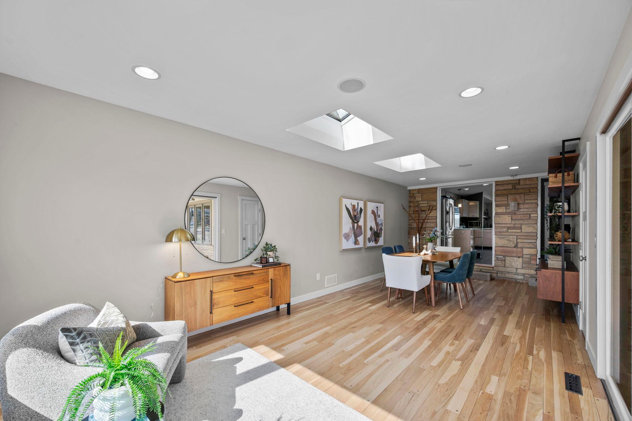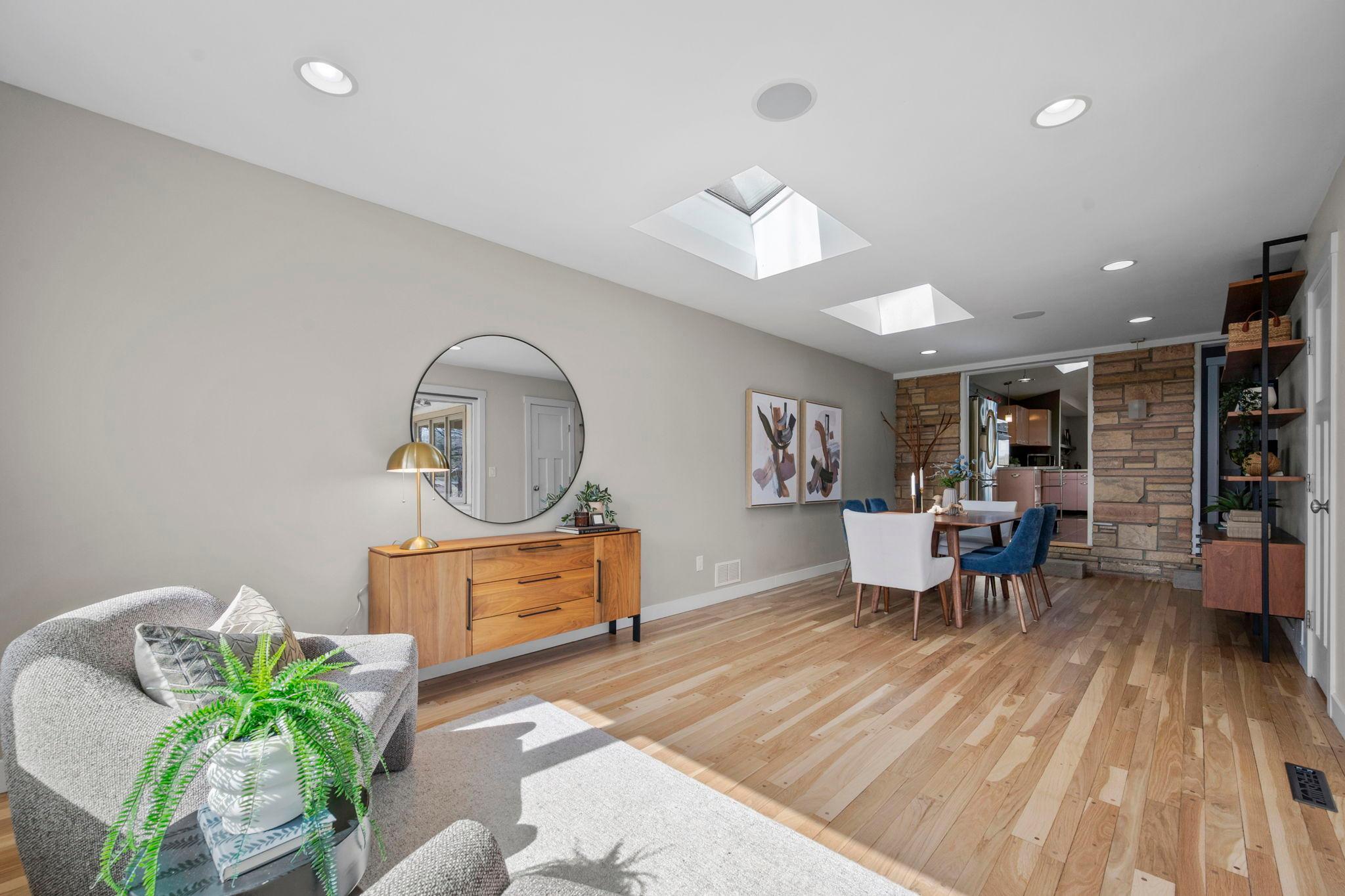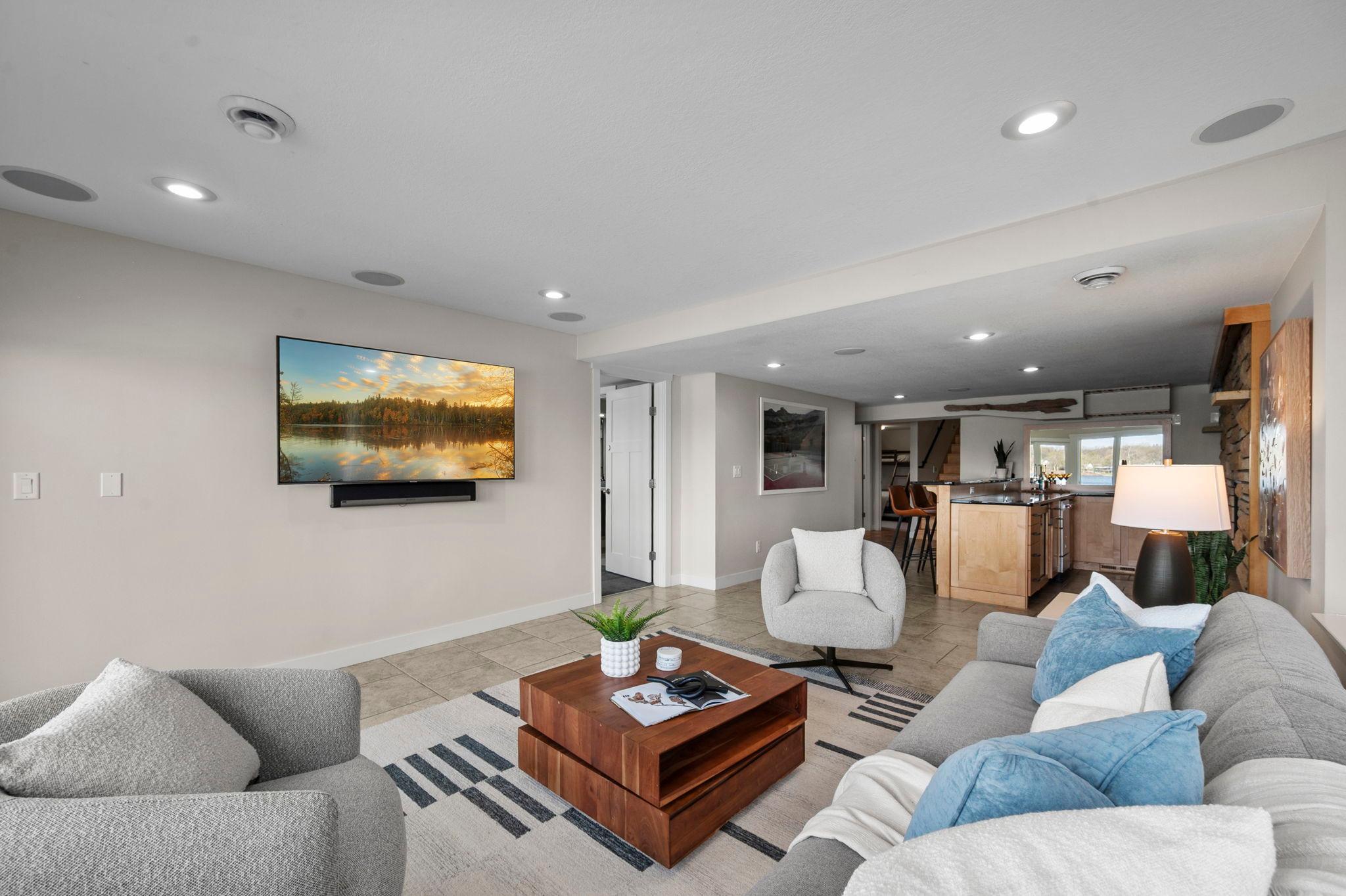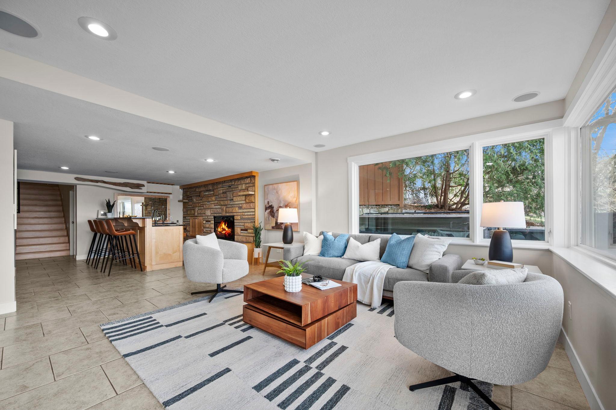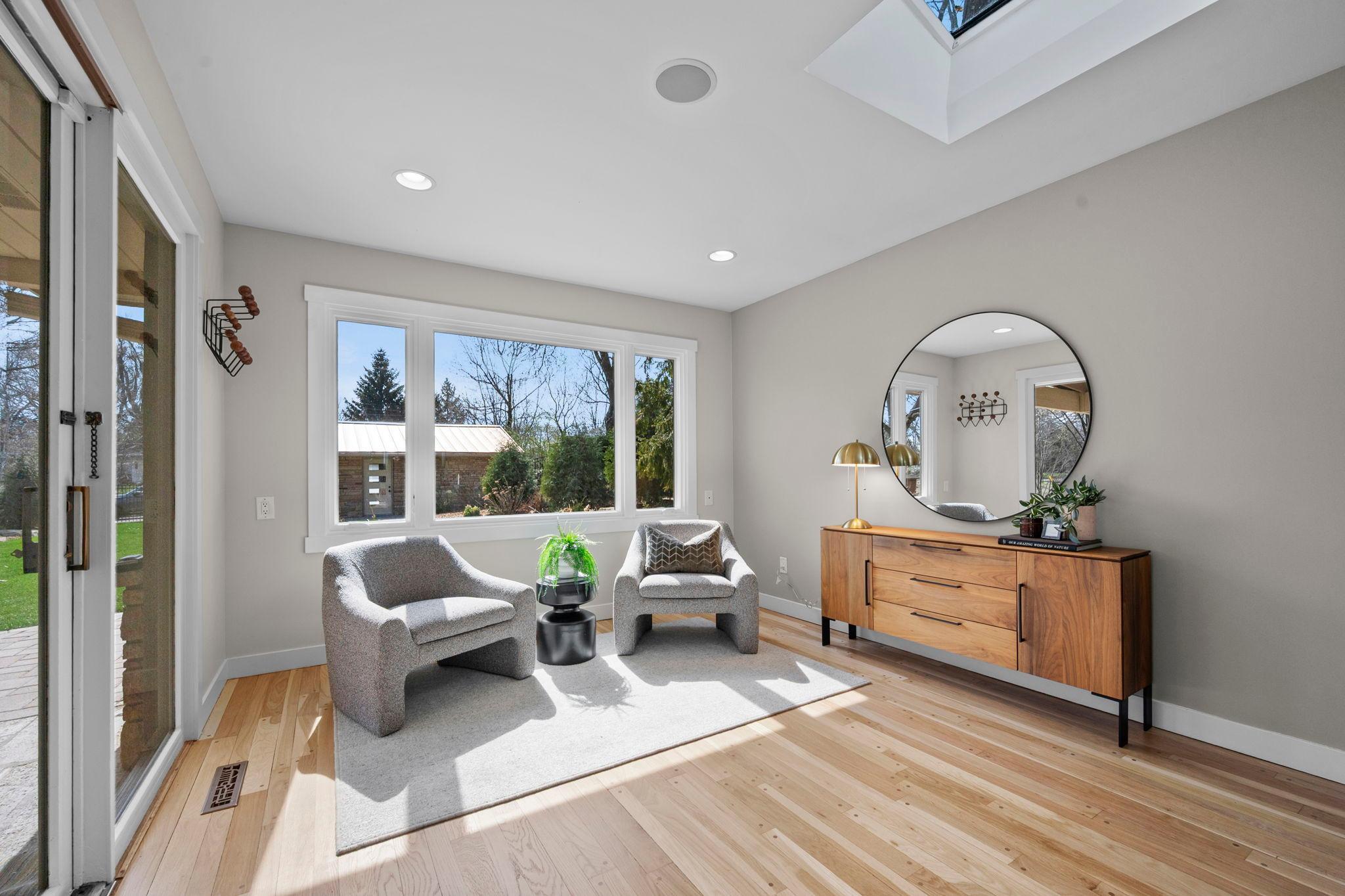 Stunning mid-century rambler on Lake Josephine—an exceptionally rare opportunity in the sought-after 621 school district. This 4-bedroom + office, 3-bath, 2+ car home is perfectly designed for effortless living, low maintenance, and unforgettable entertaining—an uncommon combination for lakefront property. Perched among the trees, the home offers breathtaking lake views from nearly every room, while still being just 12 minutes from both downtowns. Lovingly restored over time by a long-term owner, every detail reflects thoughtful upgrades and high-quality craftsmanship intended for forever living. Custom woodwork shines throughout, featuring hickory and original peg hardwood floors on the main level, along with a striking walnut mantle in the great room and office. The upper-level walnut bar includes separate wine and beverage fridges, while the lower level boasts a maple bar and custom walnut built-ins in the primary suite. The kitchen’s original pink metal cabinetry delivers iconic mid-century “Mad Men” charm, complemented by a versatile main floor layout and a dramatic full wall of Kasota stone. Two bedrooms and a beautifully designed ¾ bath complete the main level. The walkout lower level lives like anything but a basement, featuring a spacious family room, custom wet bar, and serene primary suite with panoramic lake views. The suite includes dual closets and a spa-like bath with custom tilework, steam shower, soaking tub, and dual vanities. A fourth bedroom, additional ¾ bath, laundry room with custom dog shower, and workout/storage space complete the level. Major updates include a metal roof, updated windows, fully redone plumbing and electrical, Kinetico water filtration system, and radon mitigation. The heated, insulated, and finished garage features custom epoxy floors. Outdoors, over $250K has been invested in professionally designed landscaping, including custom stonework, new driveway, metal fencing with four gates, paver walkways, patio, lakeside deck, putting green, and extensive low-voltage lighting. An attached storage hut provides ample space for all your lake gear. This is a one-of-a-kind property that truly has it all.