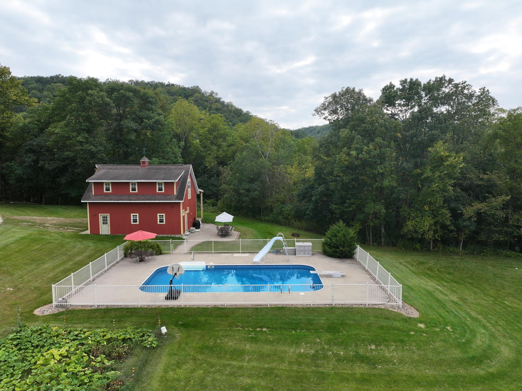 Outside, the amenities continue with a 20x40 in-ground heated swimming pool featuring an 8-foot deep end, diving board, slide, ladder, and expansive concrete surround with decorative fencing. Just steps away is a versatile two-story outbuilding offering excellent utility and entertaining potential. The building includes two overhead doors, three service doors, bathroom, indoor and outdoor showers, water heater, washer/dryer hookups, 100-amp service, separate septic system, and camper hookups with 30-amp power. A large patio overlooking the pool creates an ideal gathering space for summer entertaining or relaxing after a day outdoors.