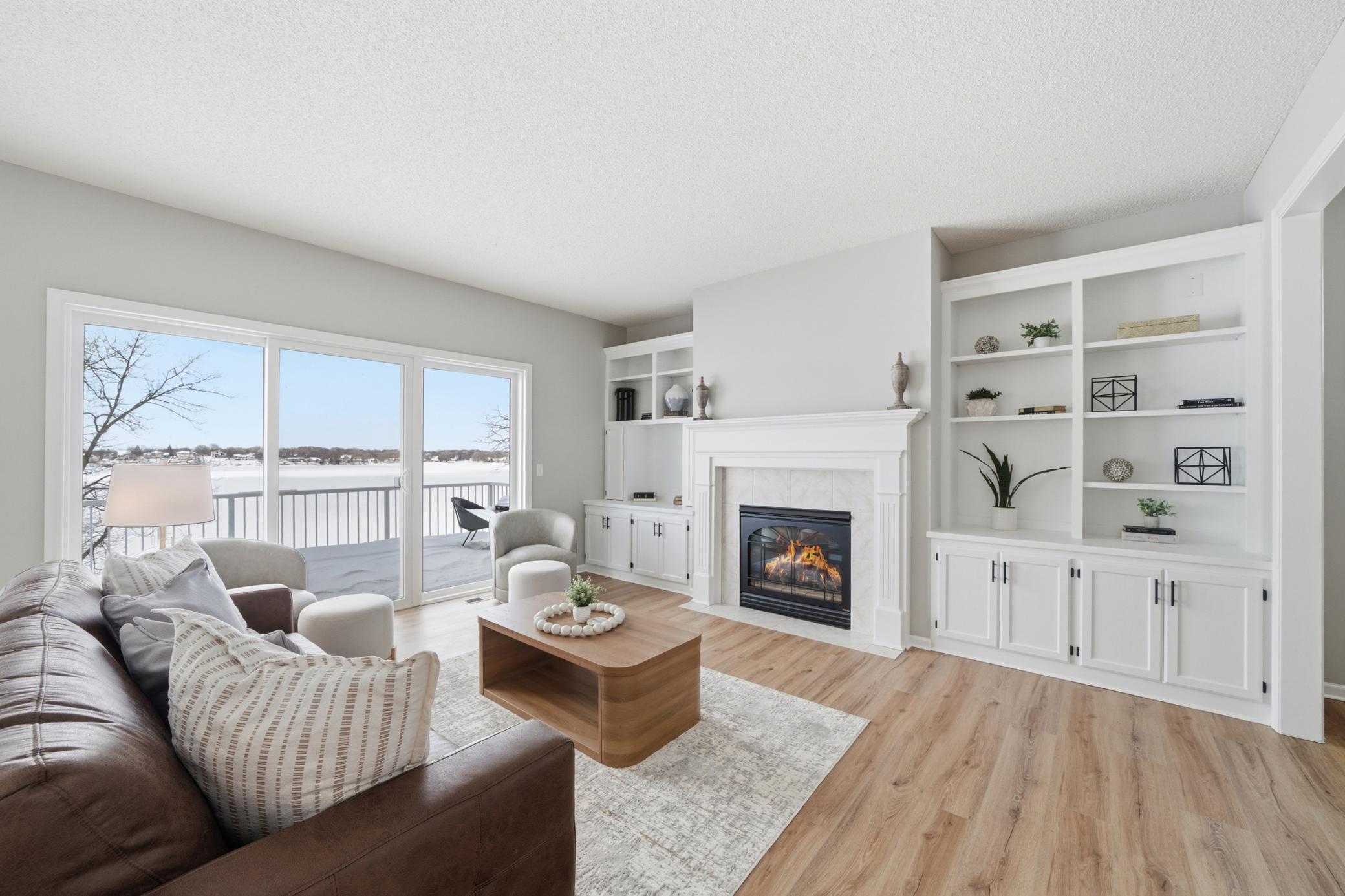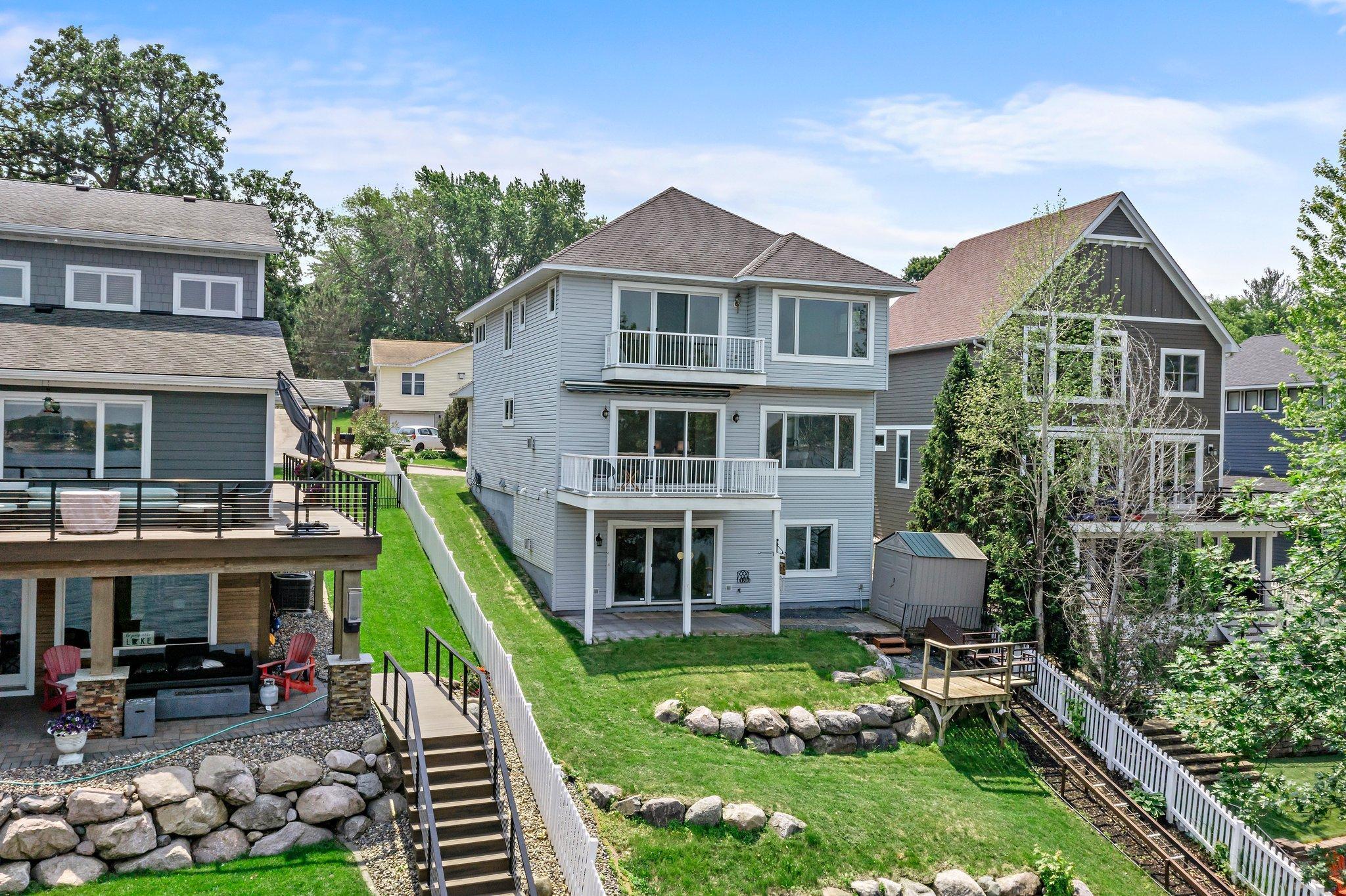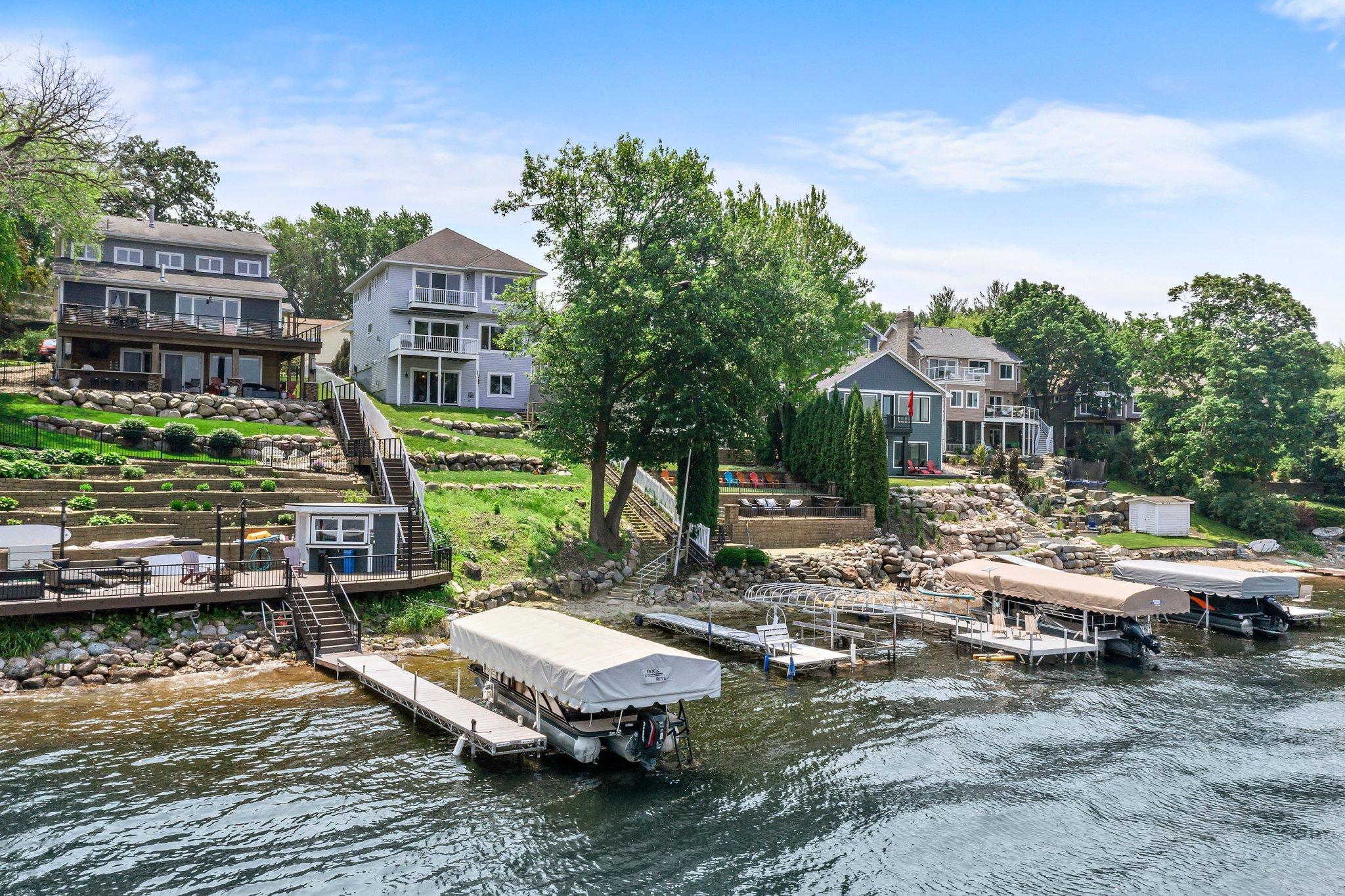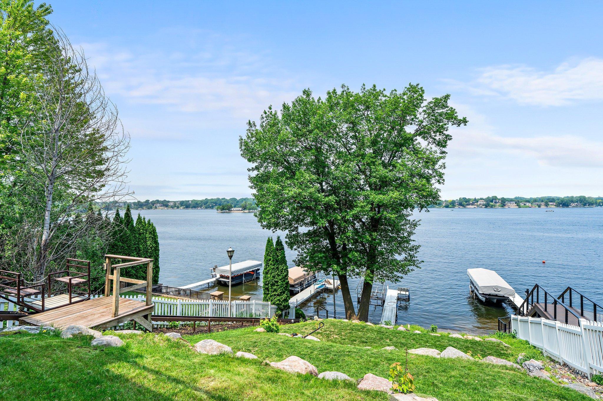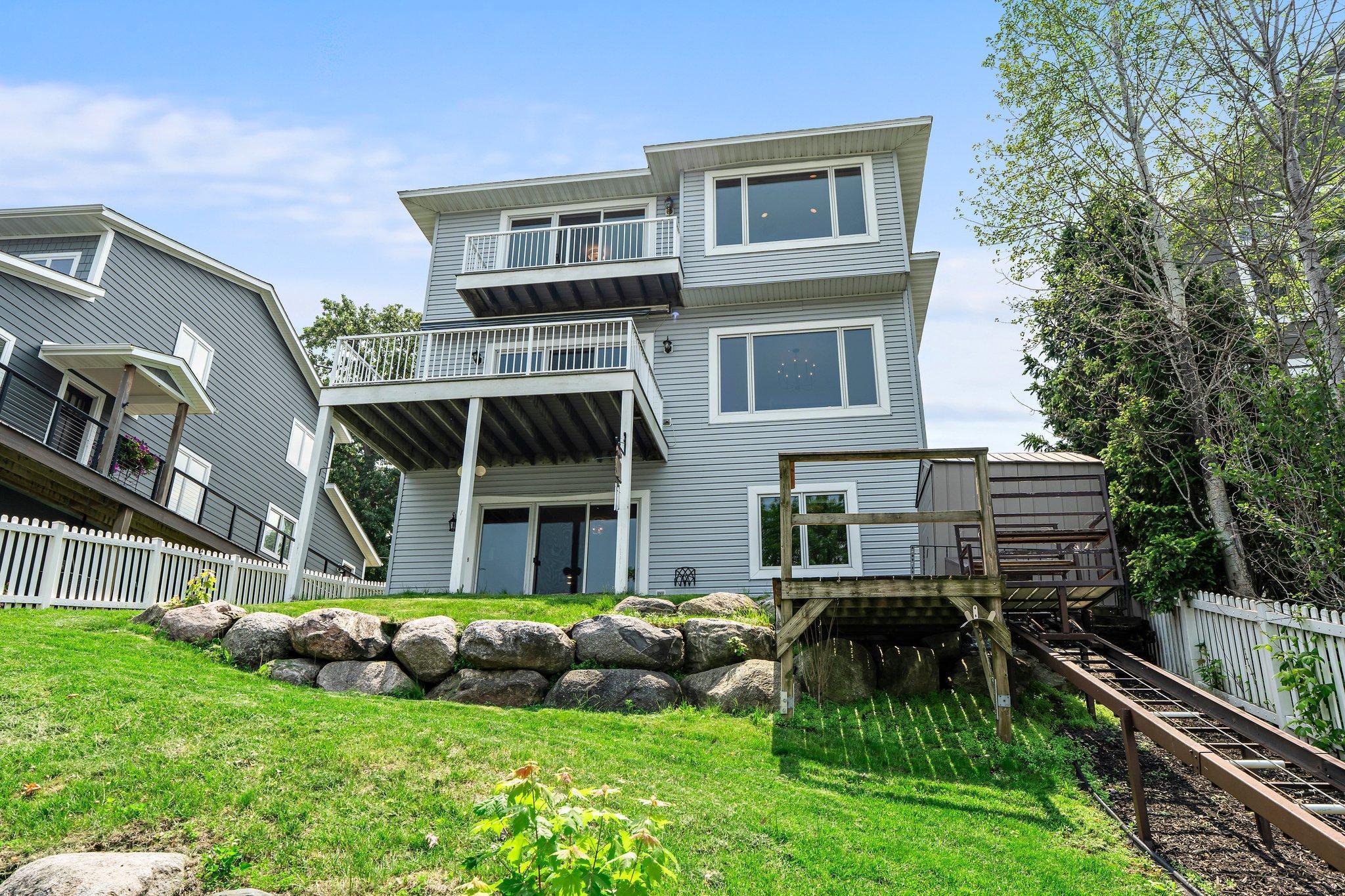 This beautifully updated Prior Lake home boasts 50 feet of sandy shoreline and sweeping lake views from nearly every room. The vaulted entry welcomes you with warm wood flooring that flows through the open main level. A spacious living room features custom built-ins, a cozy gas fireplace, and expansive windows opening to a lakeside deck—perfect for relaxing or entertaining. The kitchen is a showstopper with crisp white cabinetry, stone countertops, stainless steel appliances, tiled backsplash, and a center island with cooktop. An adjoining dining area makes every meal feel special with lake views as the backdrop. Upstairs, the private primary suite is a true retreat—double French doors open to a bright sitting area with new carpet, an ensuite ¾ bath with dual vanity, and a private balcony overlooking the water. A second bedroom, full bath, and open loft provide flexibility for family, guests, or a home office. The walkout lower level extends the living space with a family room and fireplace, an additional bedroom and bath, and a spacious laundry/mudroom—all designed to capture lake views. Outside, enjoy your own sandy beach, dock, and boat lift—easily accessed by stairs or a private lift. Just minutes from lakeside dining at Charlie’s on Prior and the heart of downtown Prior Lake, this home offers an unbeatable blend of luxury, location, and lifestyle.