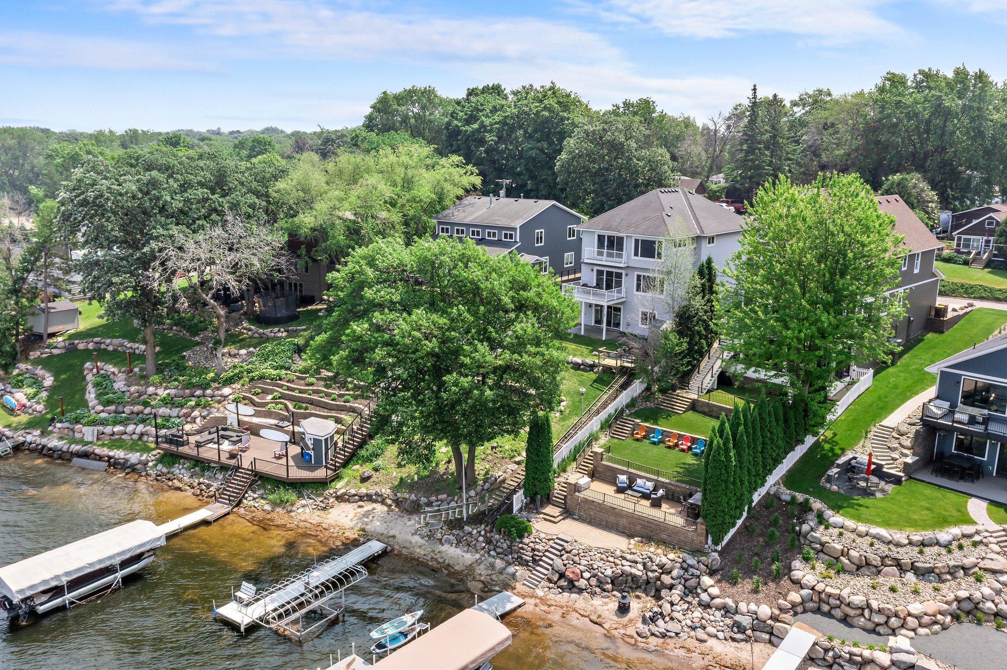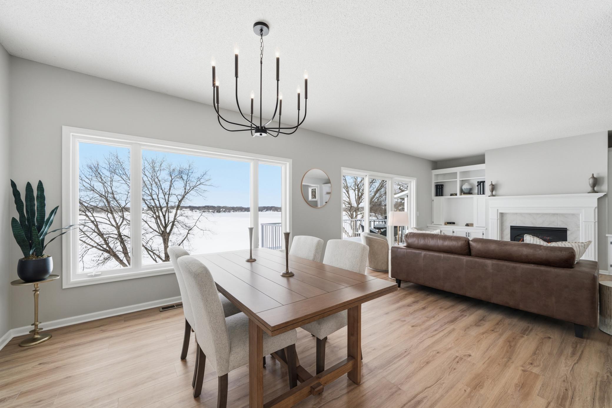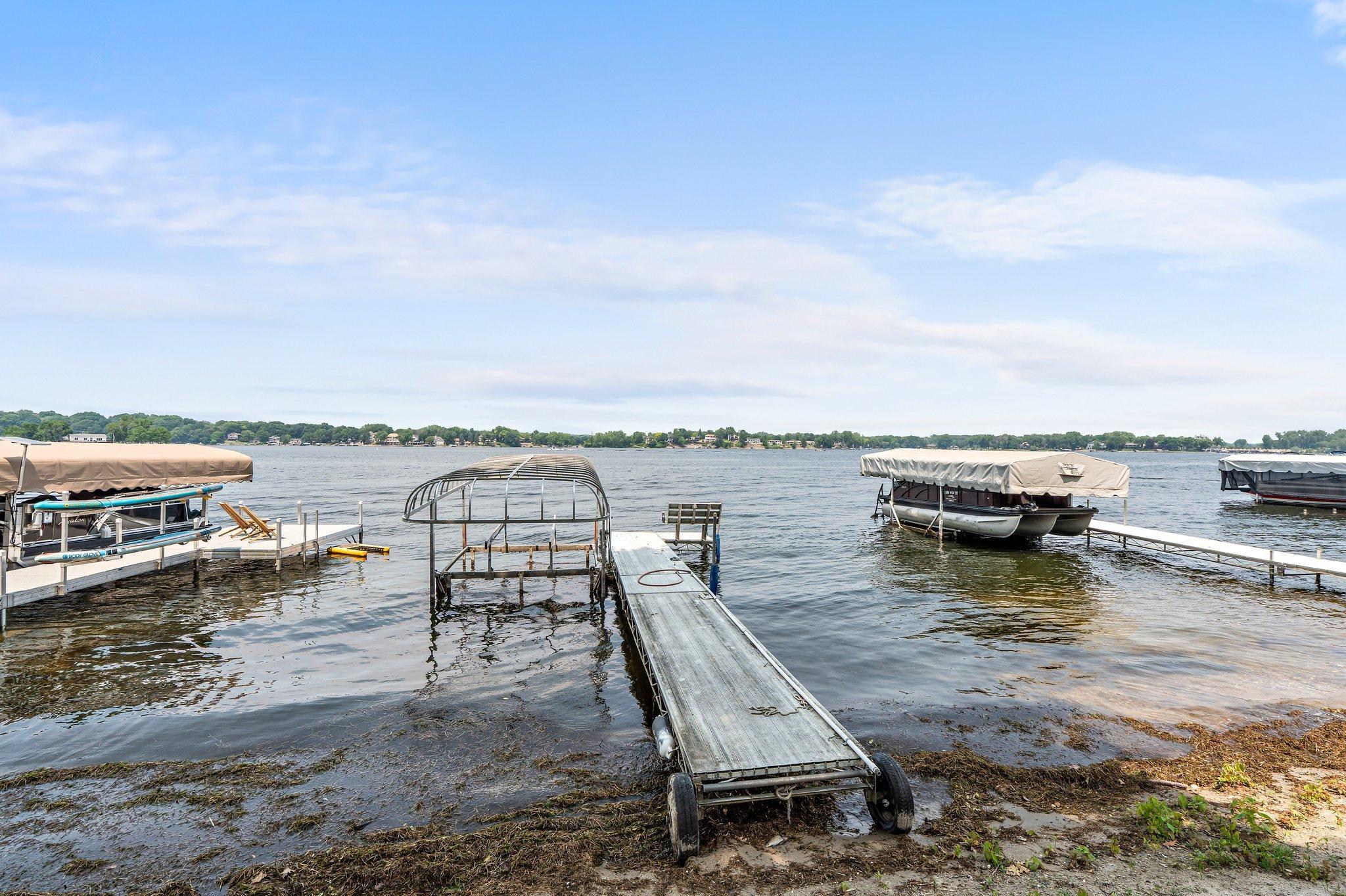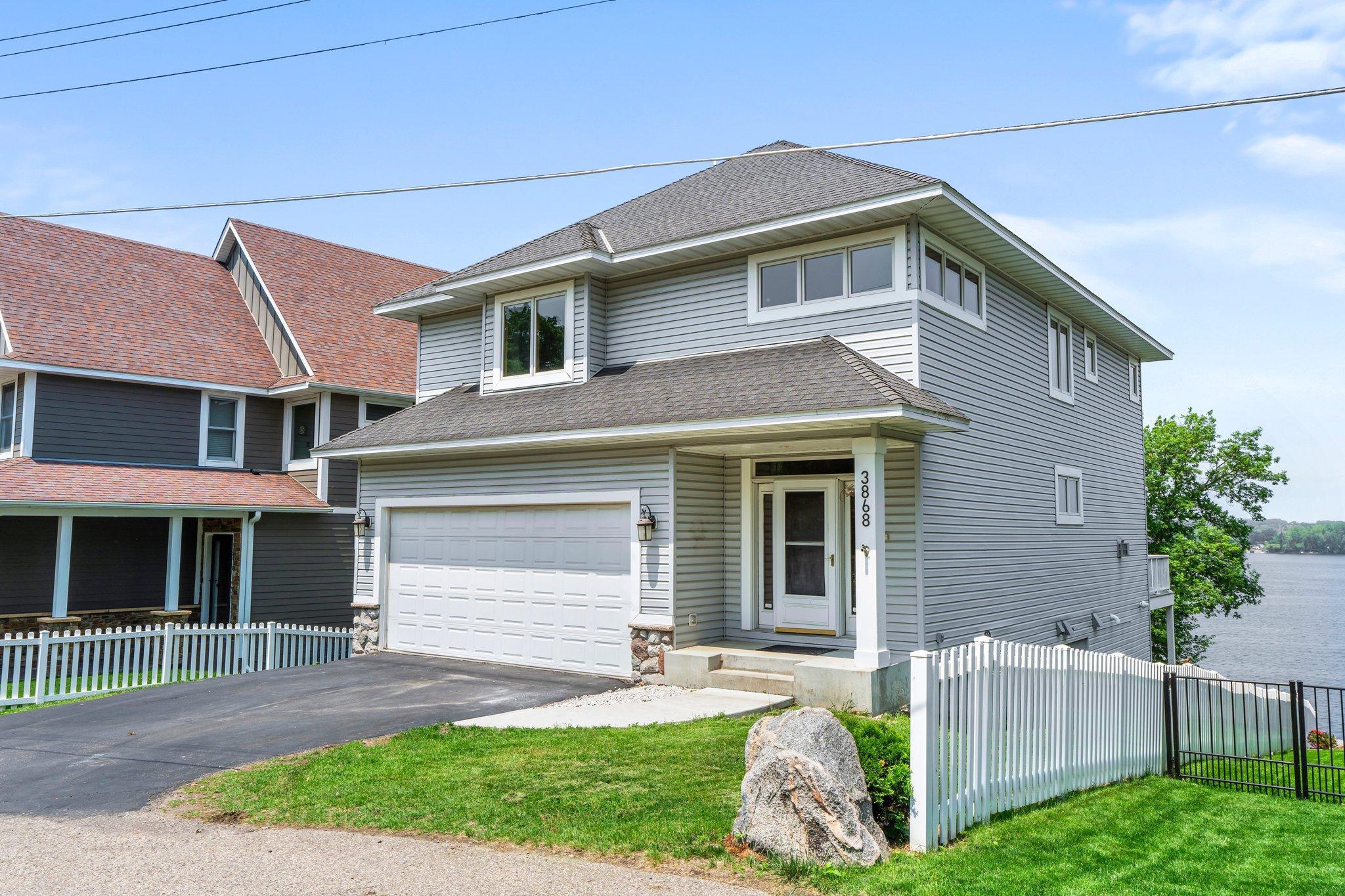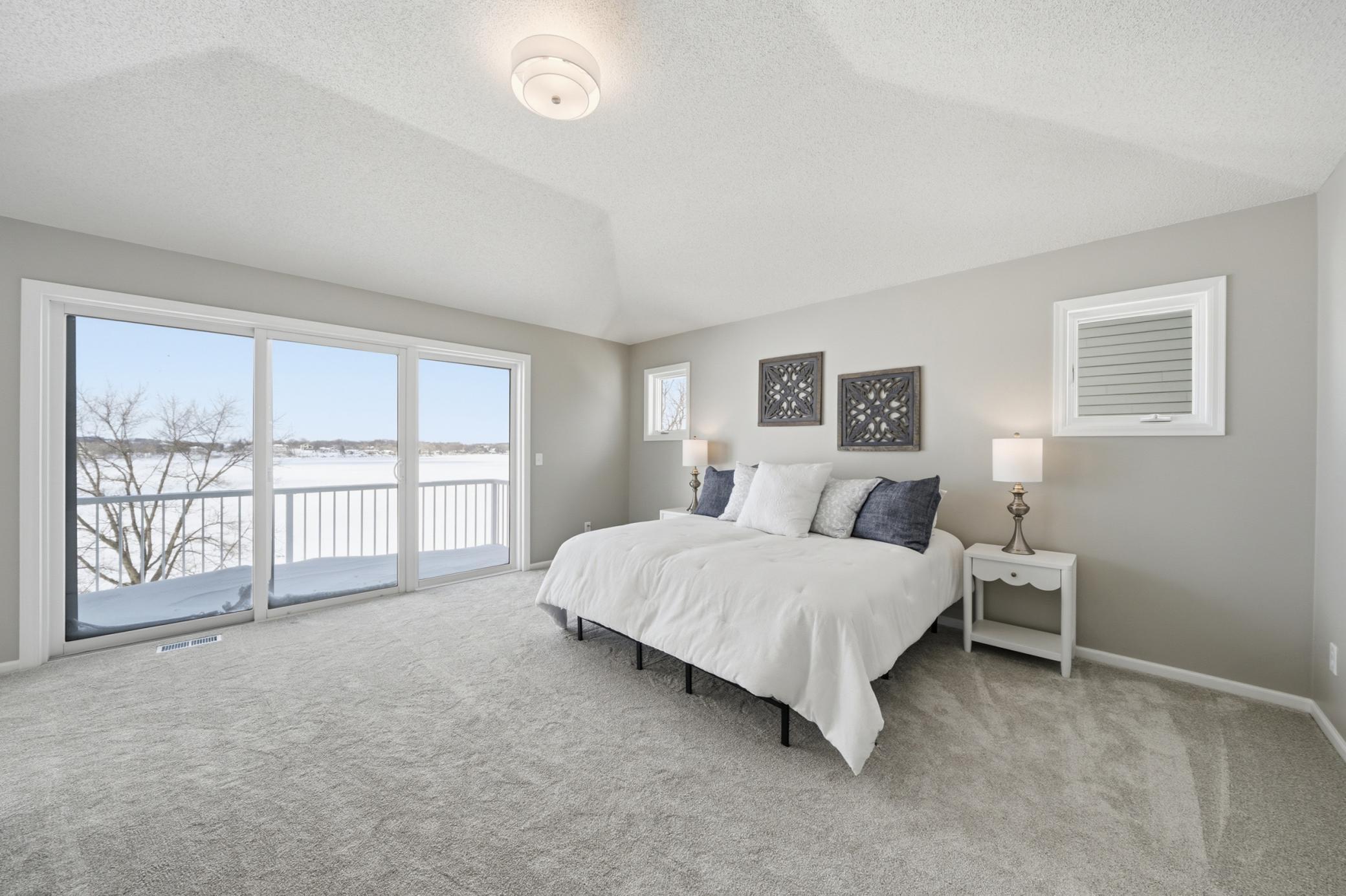 This beautifully updated Prior Lake home boasts 50 feet of sandy shoreline and sweeping lake views from nearly every room. The vaulted entry welcomes you with warm wood flooring that flows through the open main level. A spacious living room features custom built-ins, a cozy gas fireplace, and expansive windows opening to a lakeside deck—perfect for relaxing or entertaining. The kitchen is a showstopper with crisp white cabinetry, stone countertops, stainless steel appliances, tiled backsplash, and a center island with cooktop. An adjoining dining area makes every meal feel special with lake views as the backdrop. Upstairs, the private primary suite is a true retreat—double French doors open to a bright sitting area with new carpet, an ensuite ¾ bath with dual vanity, and a private balcony overlooking the water. A second bedroom, full bath, and open loft provide flexibility for family, guests, or a home office. The walkout lower level extends the living space with a family room and fireplace, an additional bedroom and bath, and a spacious laundry/mudroom—all designed to capture lake views. Outside, enjoy your own sandy beach, dock, and boat lift—easily accessed by stairs or a private lift. Just minutes from lakeside dining at Charlie’s on Prior and the heart of downtown Prior Lake, this home offers an unbeatable blend of luxury, location, and lifestyle.