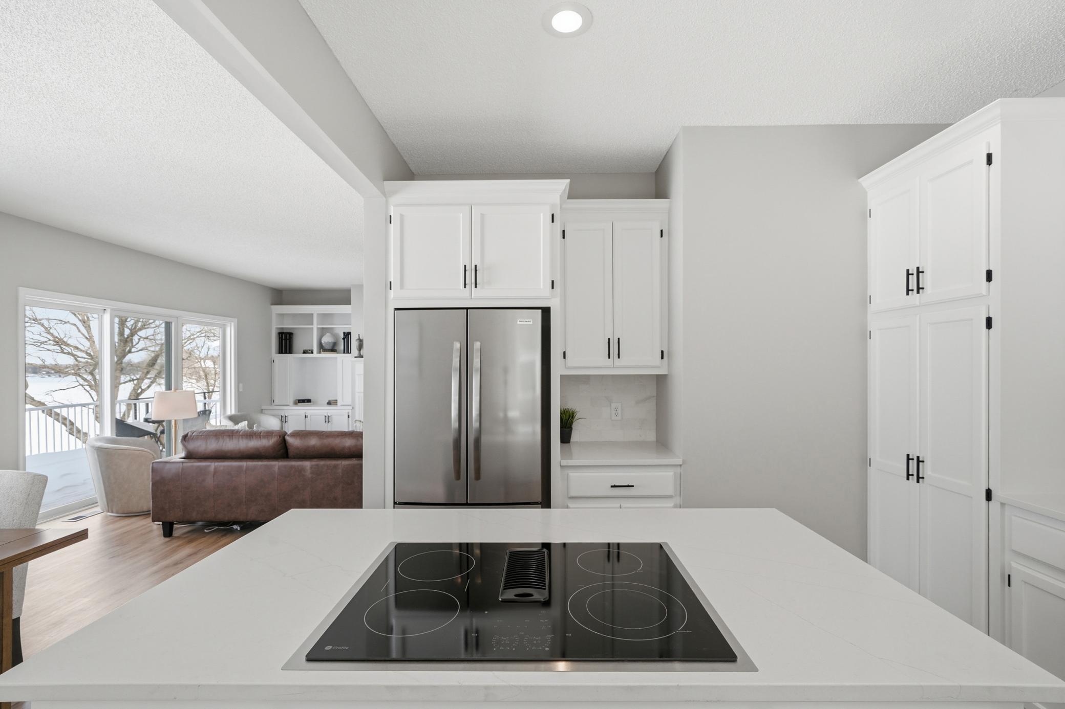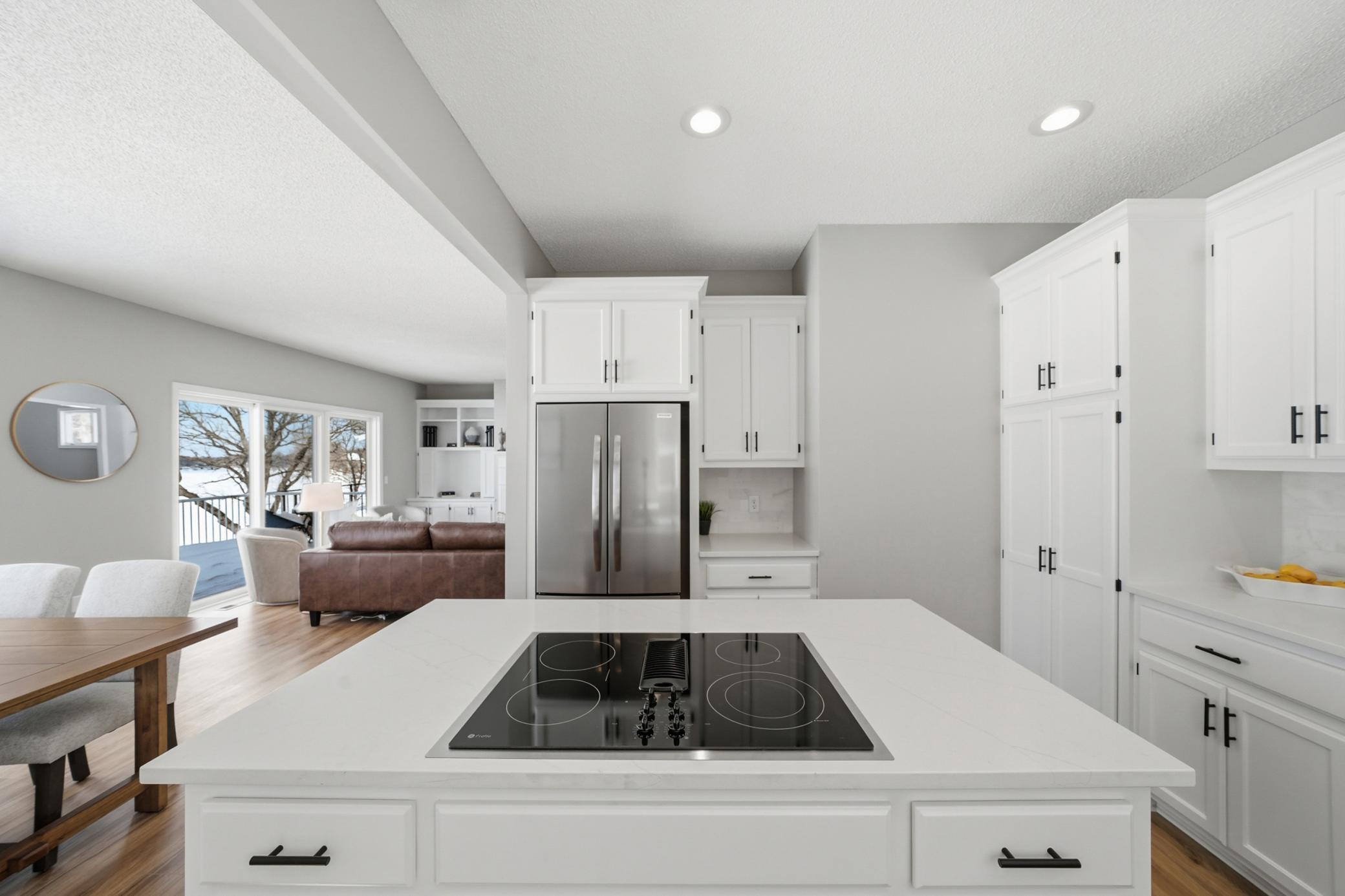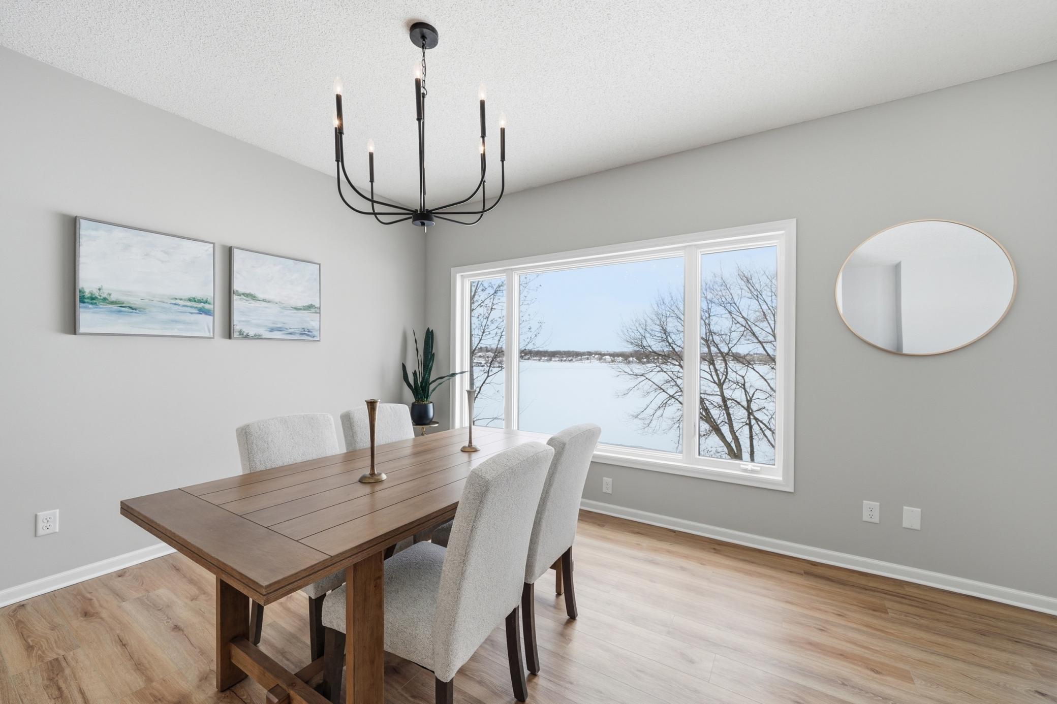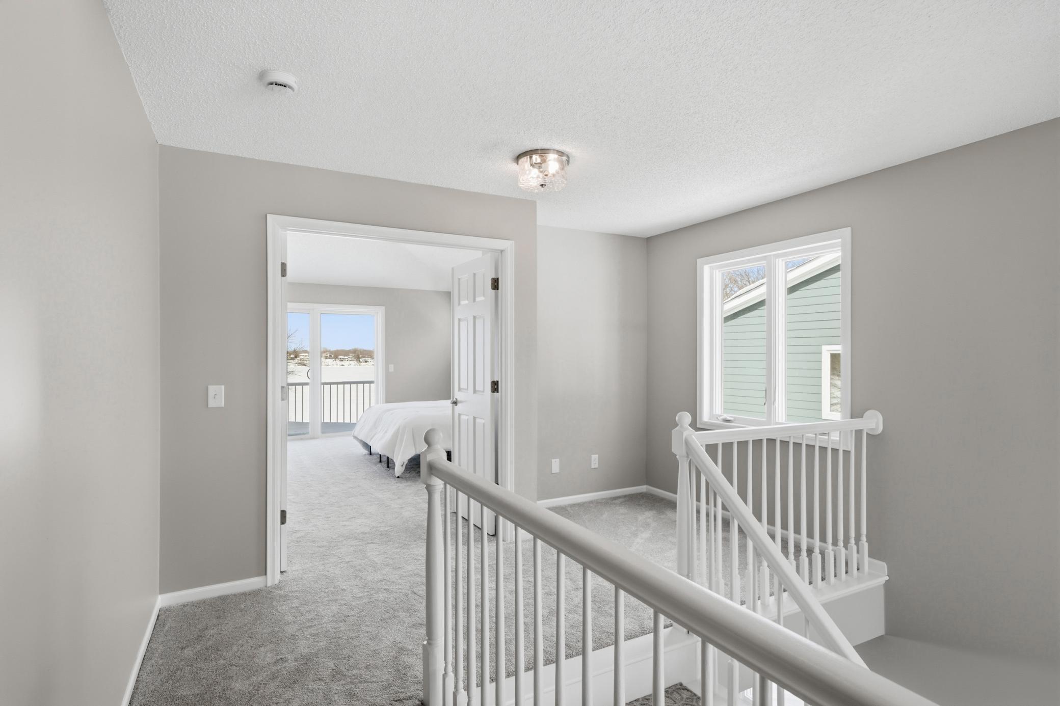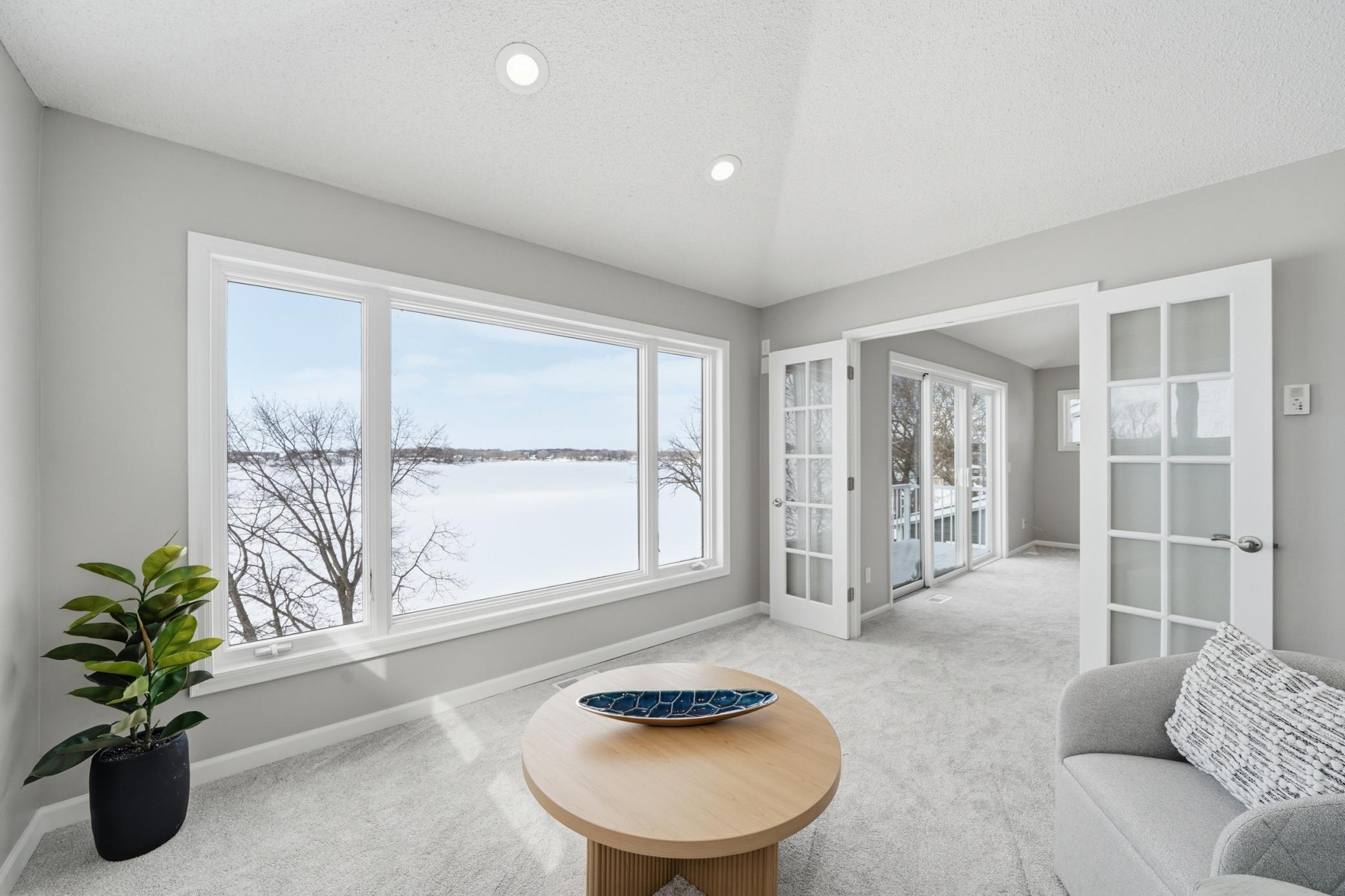 This beautifully updated Prior Lake home boasts 50 feet of sandy shoreline and sweeping lake views from nearly every room. The vaulted entry welcomes you with warm wood flooring that flows through the open main level. A spacious living room features custom built-ins, a cozy gas fireplace, and expansive windows opening to a lakeside deck—perfect for relaxing or entertaining. The kitchen is a showstopper with crisp white cabinetry, stone countertops, stainless steel appliances, tiled backsplash, and a center island with cooktop. An adjoining dining area makes every meal feel special with lake views as the backdrop. Upstairs, the private primary suite is a true retreat—double French doors open to a bright sitting area with new carpet, an ensuite ¾ bath with dual vanity, and a private balcony overlooking the water. A second bedroom, full bath, and open loft provide flexibility for family, guests, or a home office. The walkout lower level extends the living space with a family room and fireplace, an additional bedroom and bath, and a spacious laundry/mudroom—all designed to capture lake views. Outside, enjoy your own sandy beach, dock, and boat lift—easily accessed by stairs or a private lift. Just minutes from lakeside dining at Charlie’s on Prior and the heart of downtown Prior Lake, this home offers an unbeatable blend of luxury, location, and lifestyle.