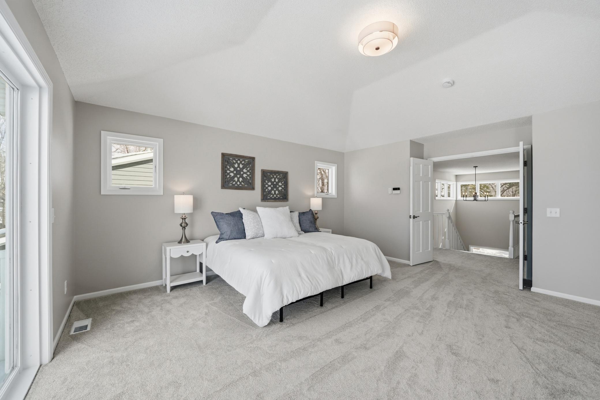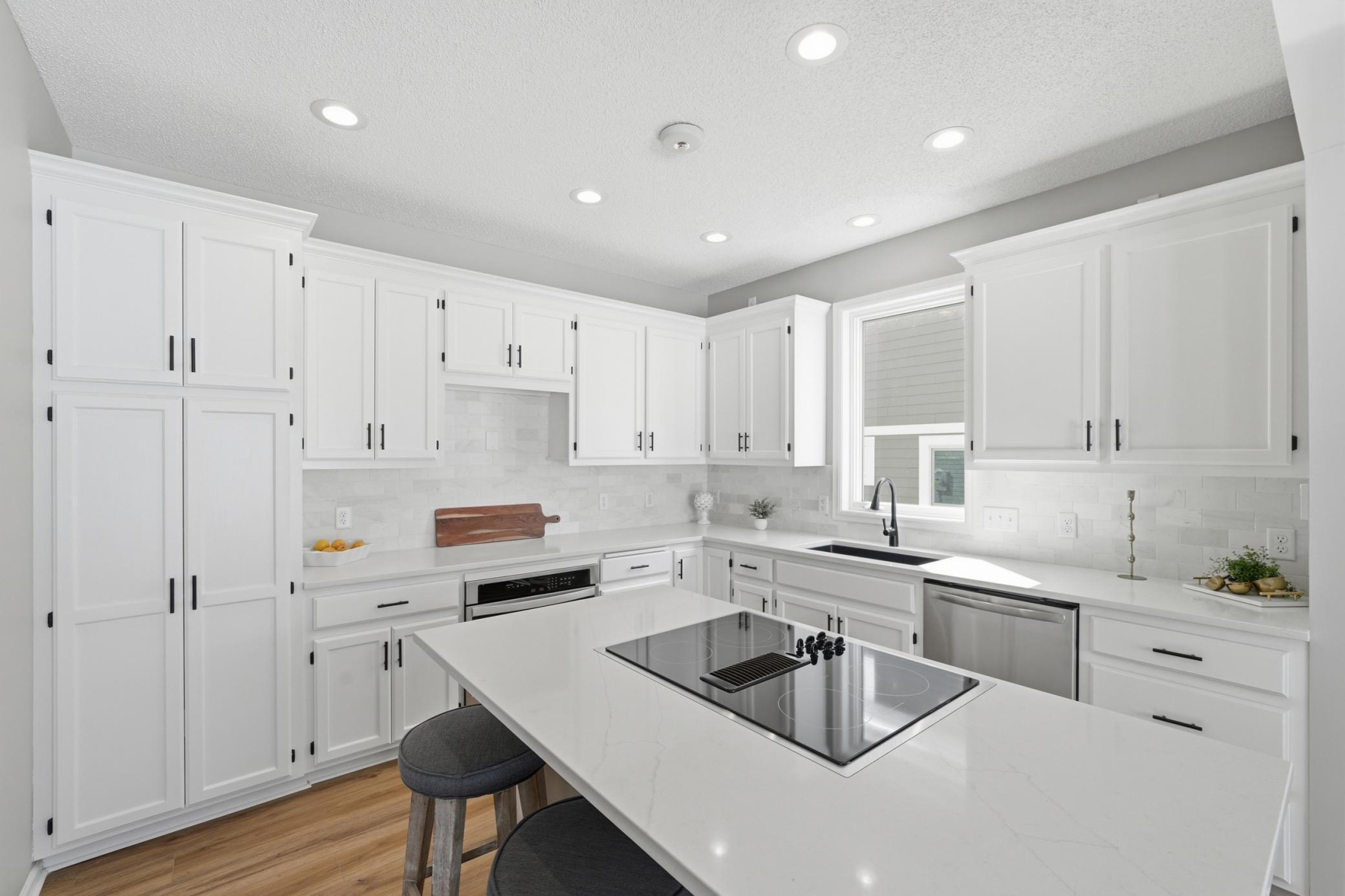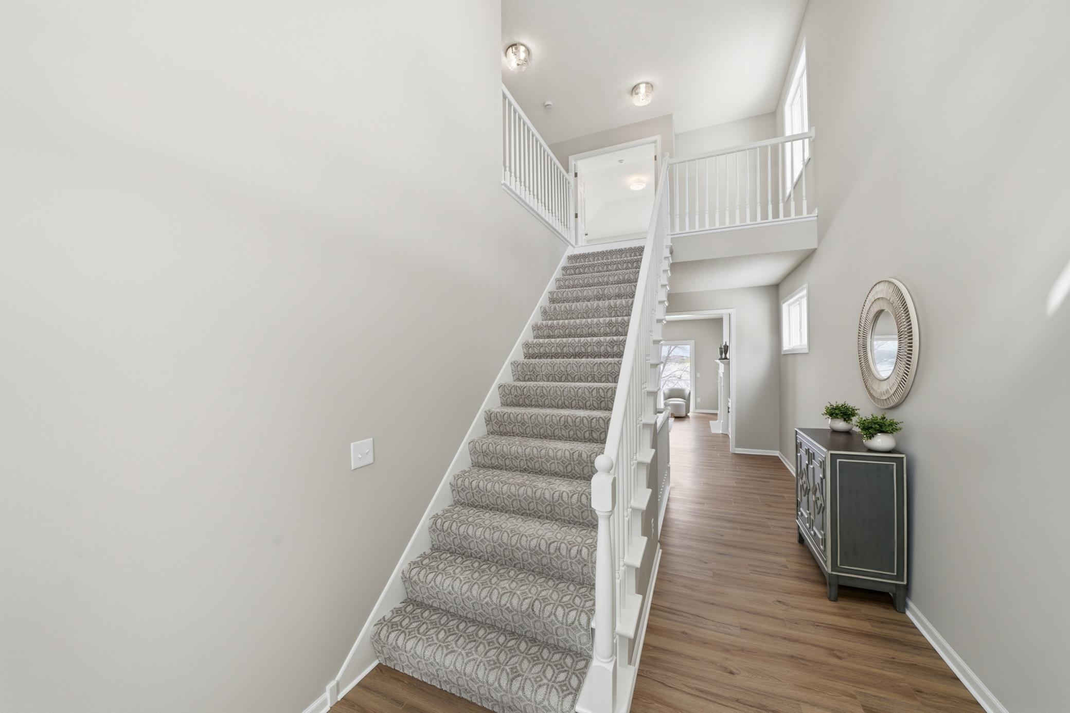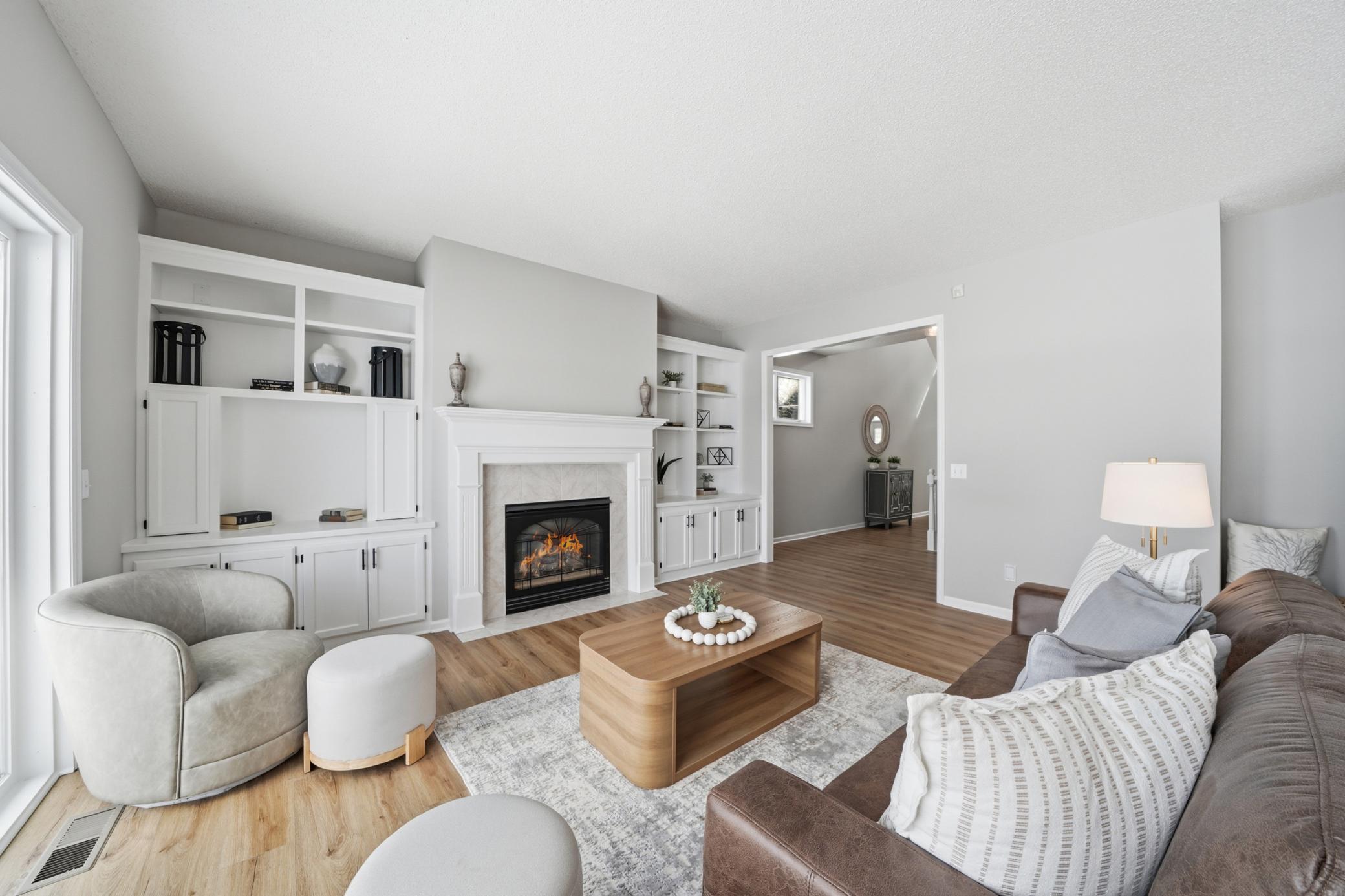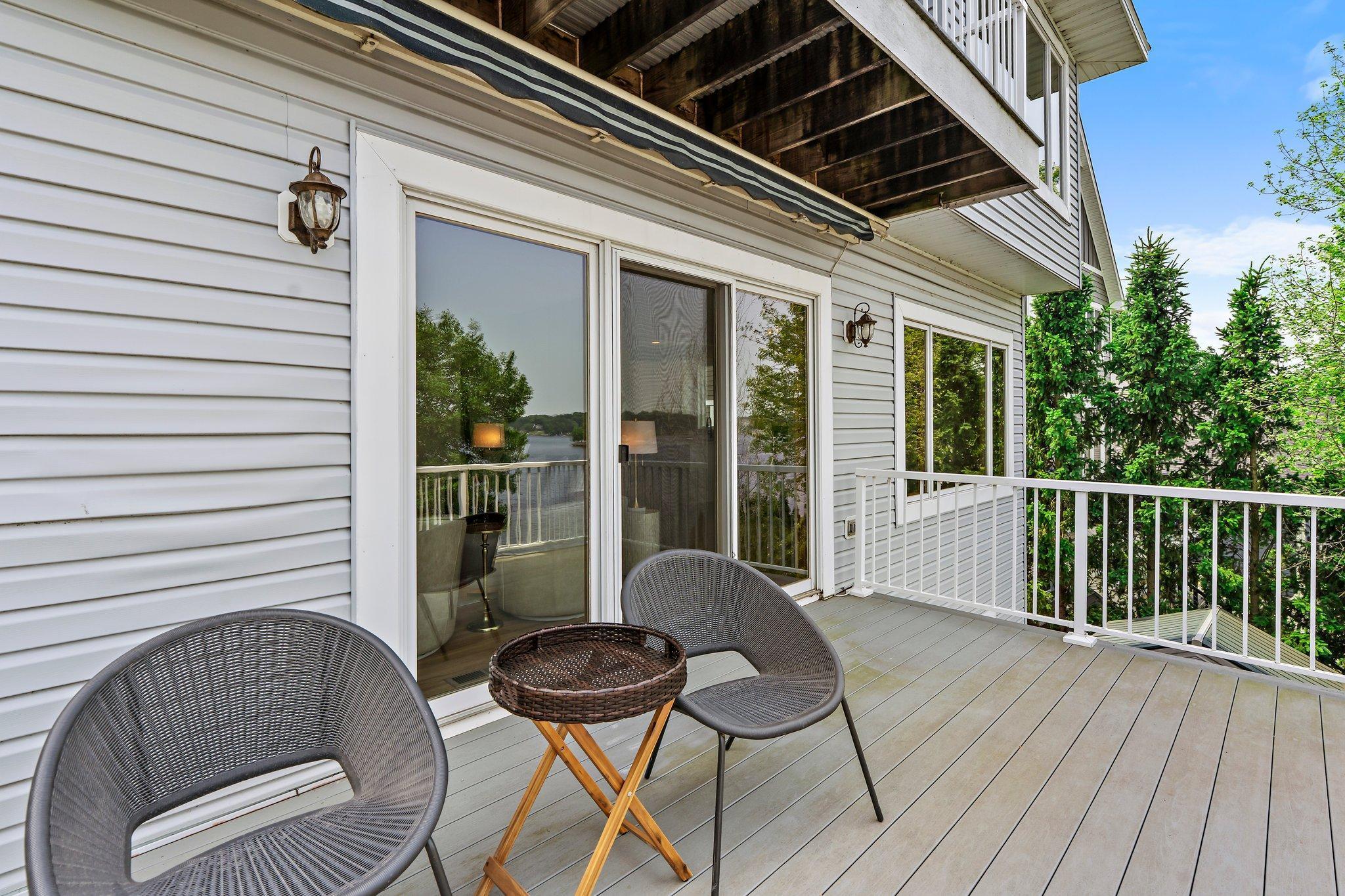 This beautifully updated Prior Lake home boasts 50 feet of sandy shoreline and sweeping lake views from nearly every room. The vaulted entry welcomes you with warm wood flooring that flows through the open main level. A spacious living room features custom built-ins, a cozy gas fireplace, and expansive windows opening to a lakeside deck—perfect for relaxing or entertaining. The kitchen is a showstopper with crisp white cabinetry, stone countertops, stainless steel appliances, tiled backsplash, and a center island with cooktop. An adjoining dining area makes every meal feel special with lake views as the backdrop. Upstairs, the private primary suite is a true retreat—double French doors open to a bright sitting area with new carpet, an ensuite ¾ bath with dual vanity, and a private balcony overlooking the water. A second bedroom, full bath, and open loft provide flexibility for family, guests, or a home office. The walkout lower level extends the living space with a family room and fireplace, an additional bedroom and bath, and a spacious laundry/mudroom—all designed to capture lake views. Outside, enjoy your own sandy beach, dock, and boat lift—easily accessed by stairs or a private lift. Just minutes from lakeside dining at Charlie’s on Prior and the heart of downtown Prior Lake, this home offers an unbeatable blend of luxury, location, and lifestyle.